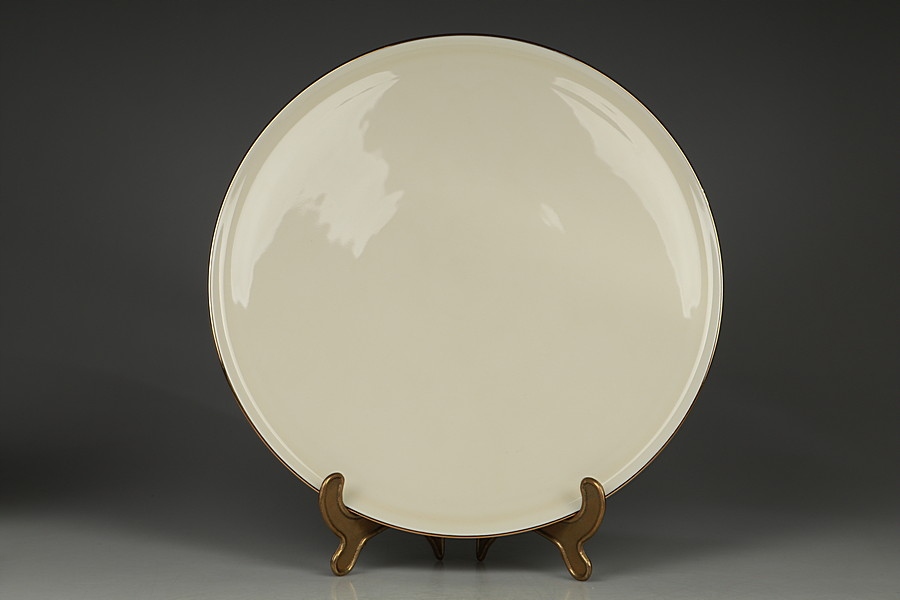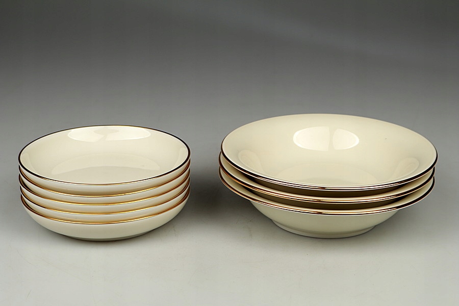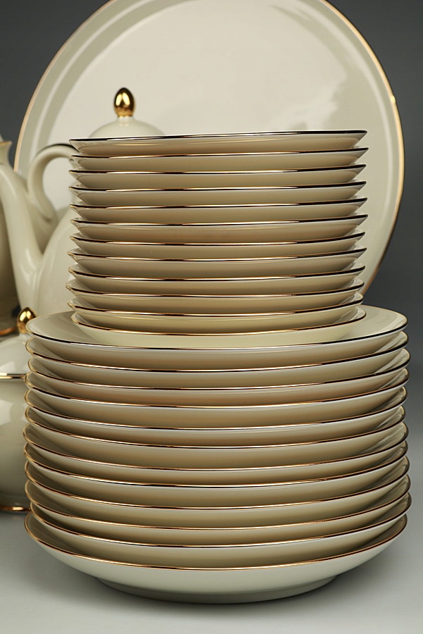 Большой фарфоровый сервиз Фюрстенбергского фарфорового завода модели Ксенжна. Обслуживание на 12 человек. Множество аксессуаров, грелка, форма для торта, тарелки, вазы и т. д. Фарфор кремового цвета, края позолочены. Состояние очень хорошее.