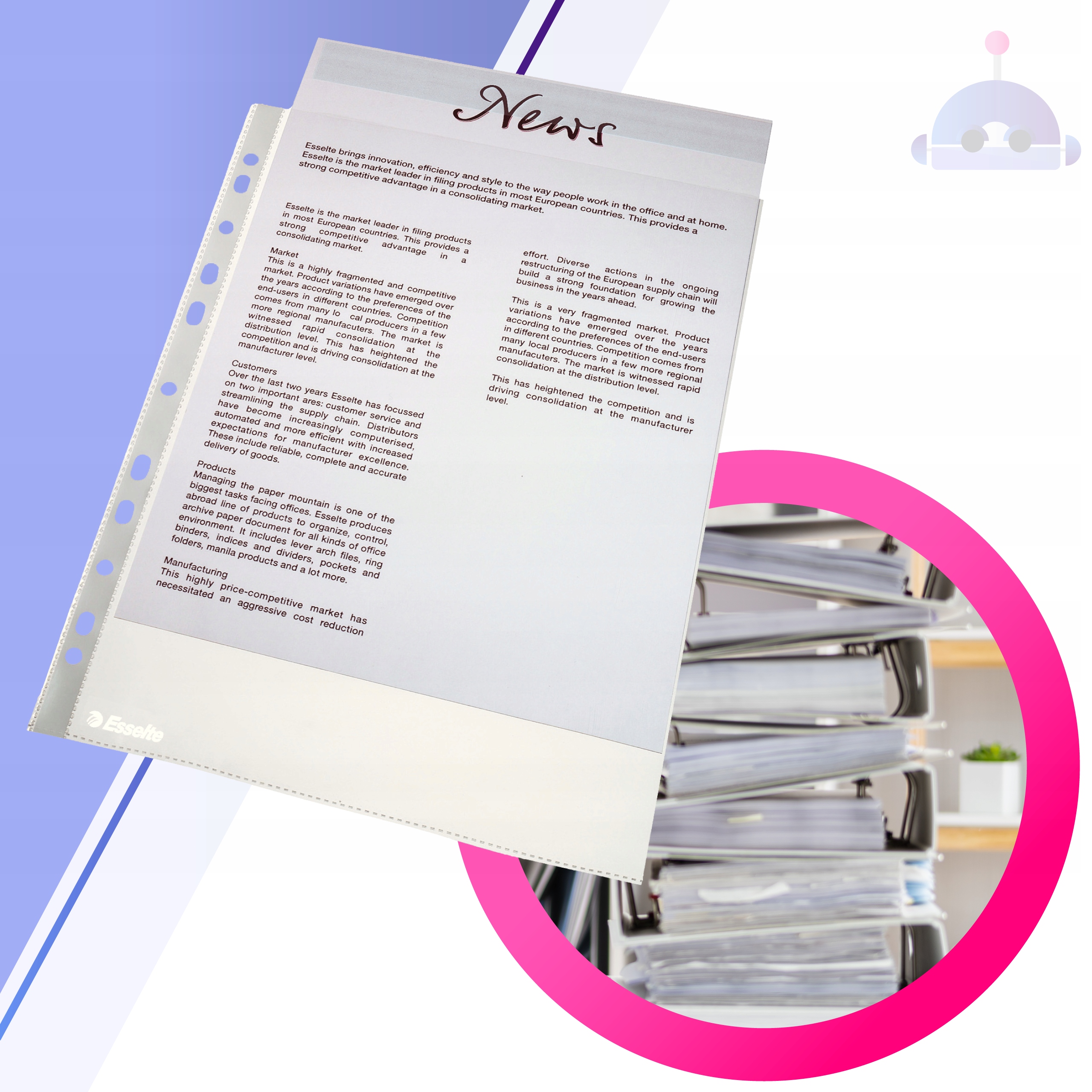 Футболки Esselte формата А4 идеально подходят дляповседневного использования. Они оснащены полосой с несколькими перфорациями, поэтому подходят для большинства папок. Кроме того, они открываются сверху, что позволяет легко вытащить необходимые документы, не отстегивая их.
