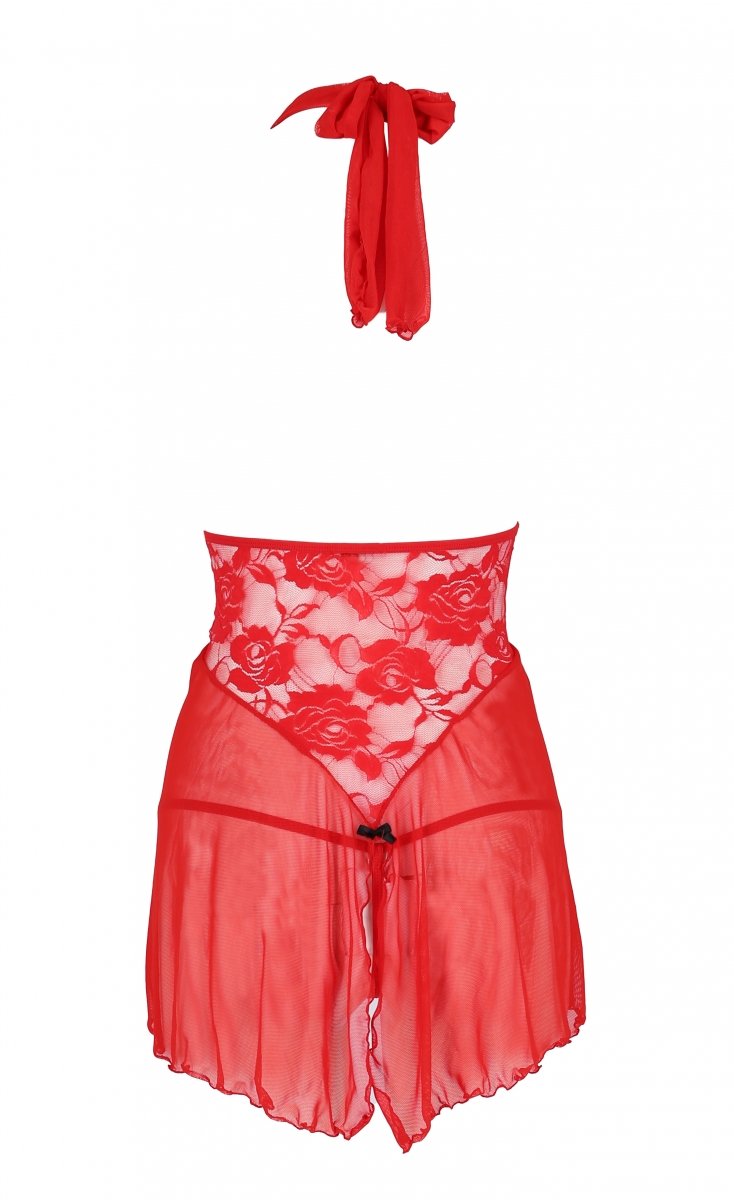 Футболка свободного кроя из тюля ярко-красного цвета. и кружево. Черные акценты в виде галстука спереди и небольшого бантика сзади, несомненно, добавляют шарма. Легко завязать футболку на шее. Сорочка Freya – это комфорт для вас, удовольствие для вас обоих.