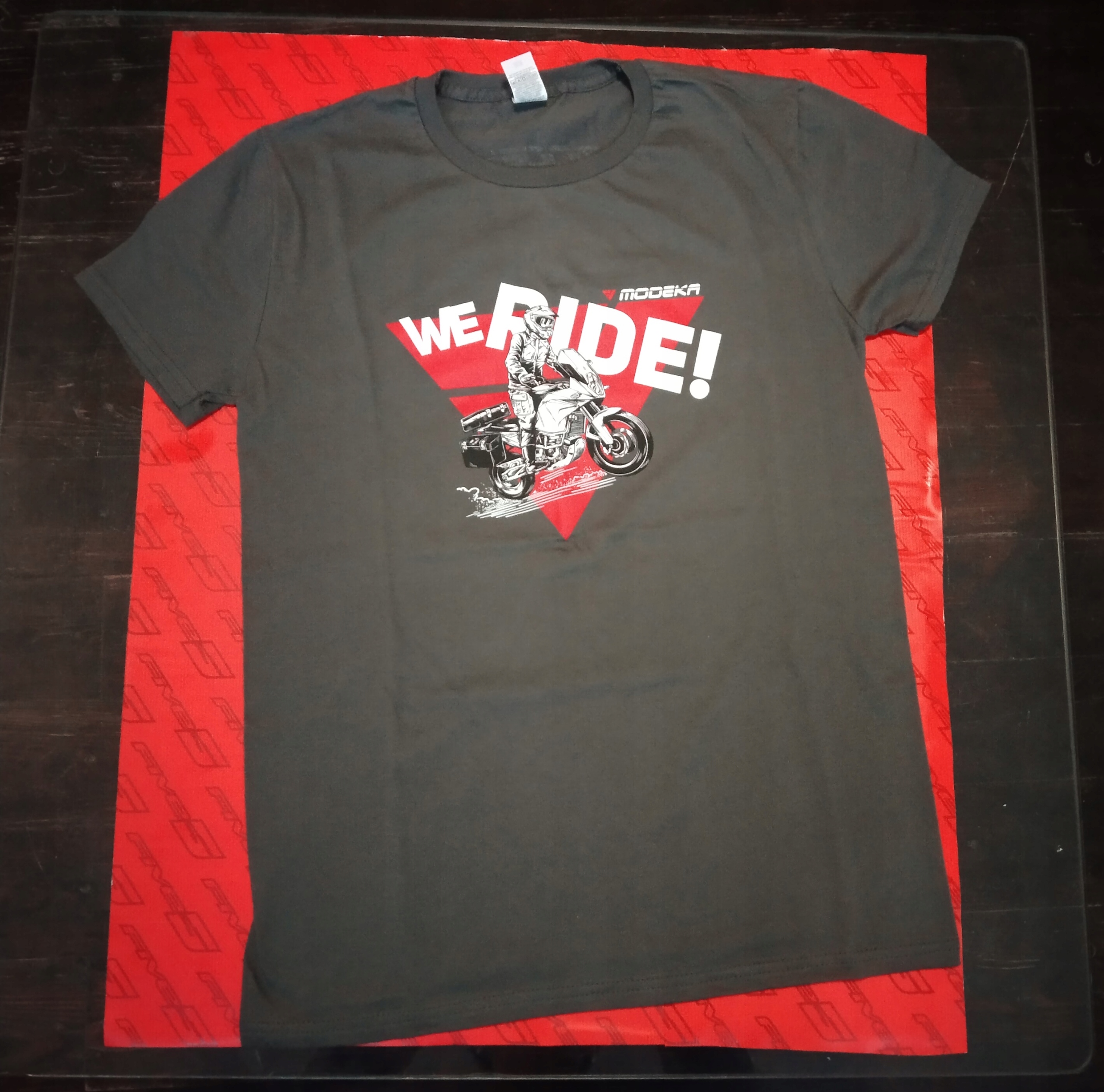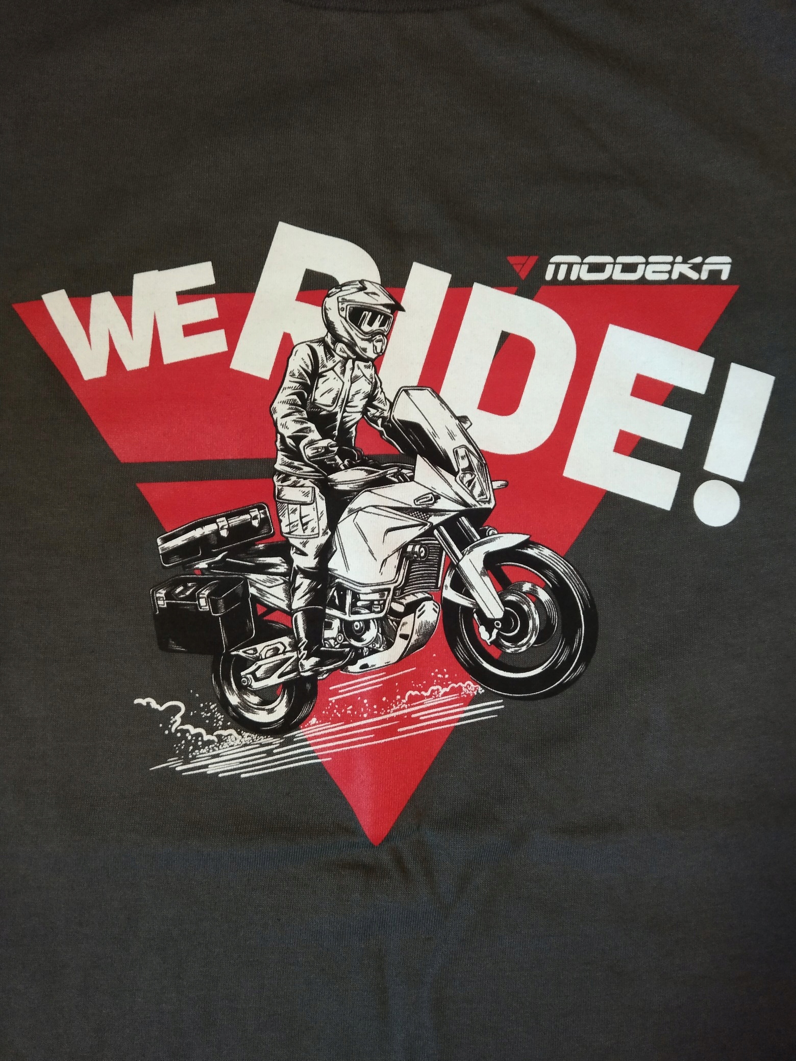 Идеальный подарок для человека, который любит ездить на туристических мотоциклах и любит пережить сумасшедшие приключения в своей жизни. Футболка изготовлена из 100% хлопка. Футболка торговой марки FRUIT of The LOOM, что подтверждает высокое качество изготовления. Спереди имеется принт, изображающий мотоциклиста, стоящего на приключенческом мотоцикле. На заднем плане — красный логотип бренда MODEKA и слоган WE RIDE. На спине рубашки расположенлоготип MODEKA.