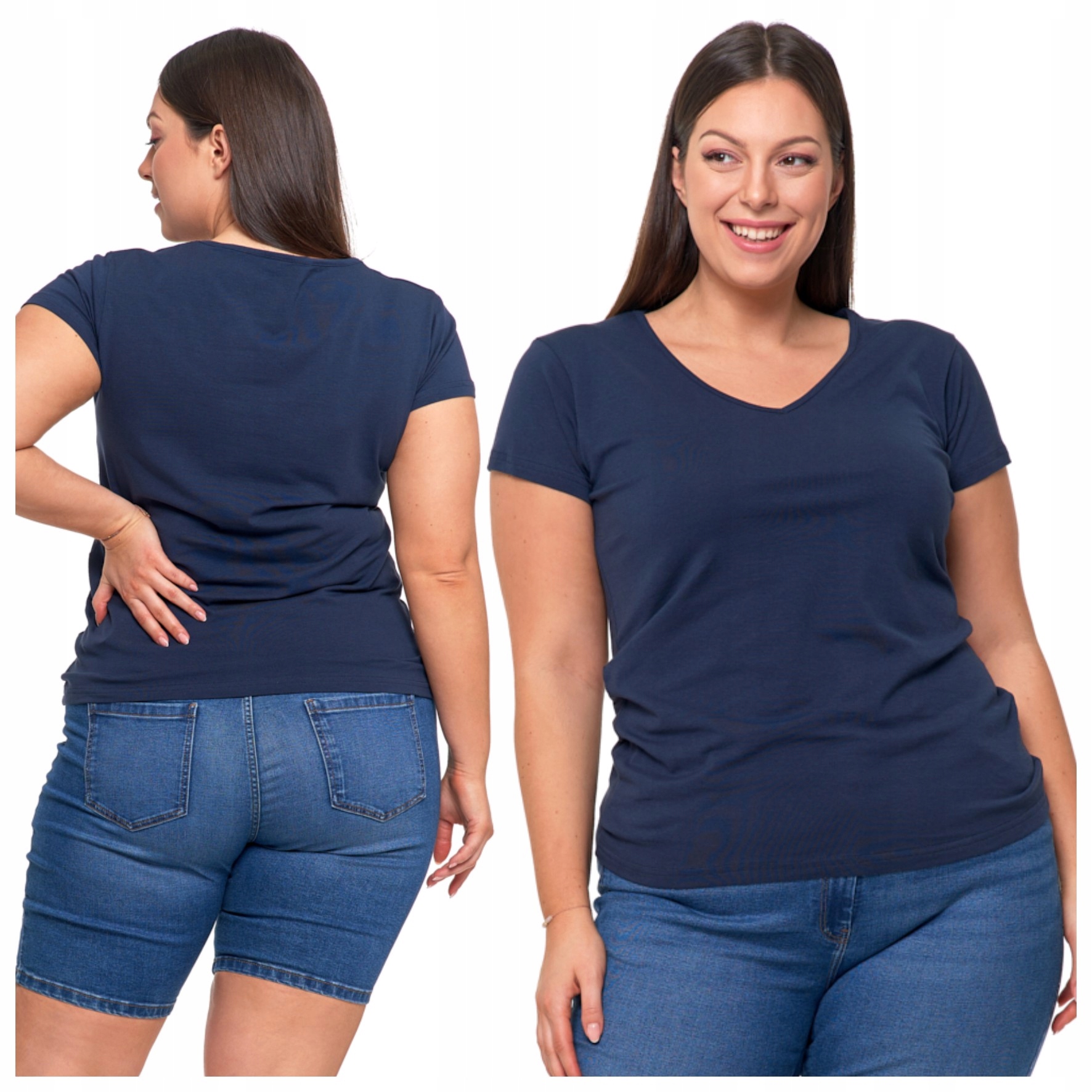 Представляем элегантную темно-синюю футболку больших размеров с V-образным вырезом из нашей уникальной коллекции BASIC. Это одежда, которая не только подчеркивает индивидуальность, но и создана для женщин больших размеров, сочетая стиль и комфорт.