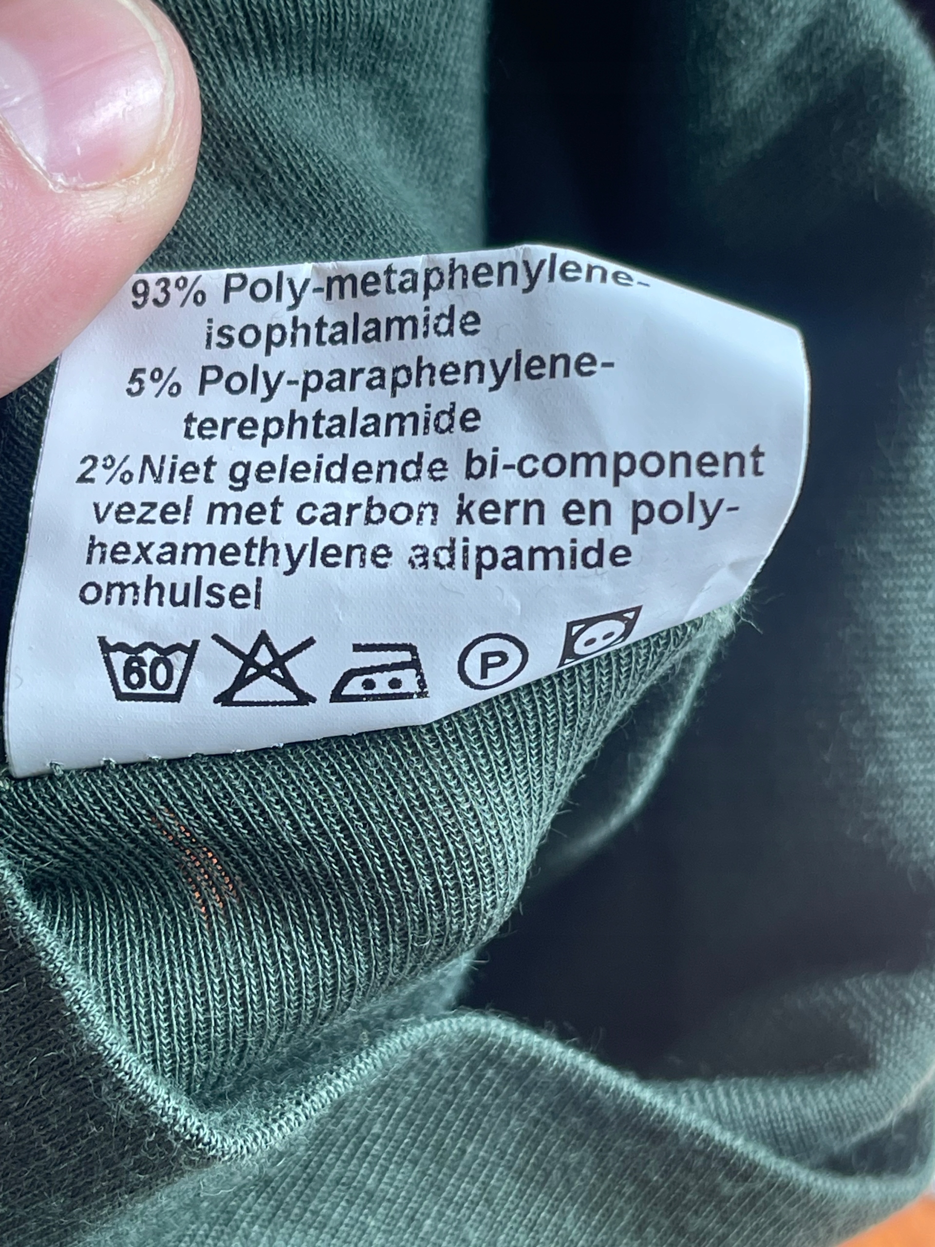 Материал: 93% полиметафенилизофталамид, 5% полипарафенилентерефталамид, 2% непроводящее двухкомпонентное волокно с углеродным сердечником и оболочкой из полигексаметилендипамида.
