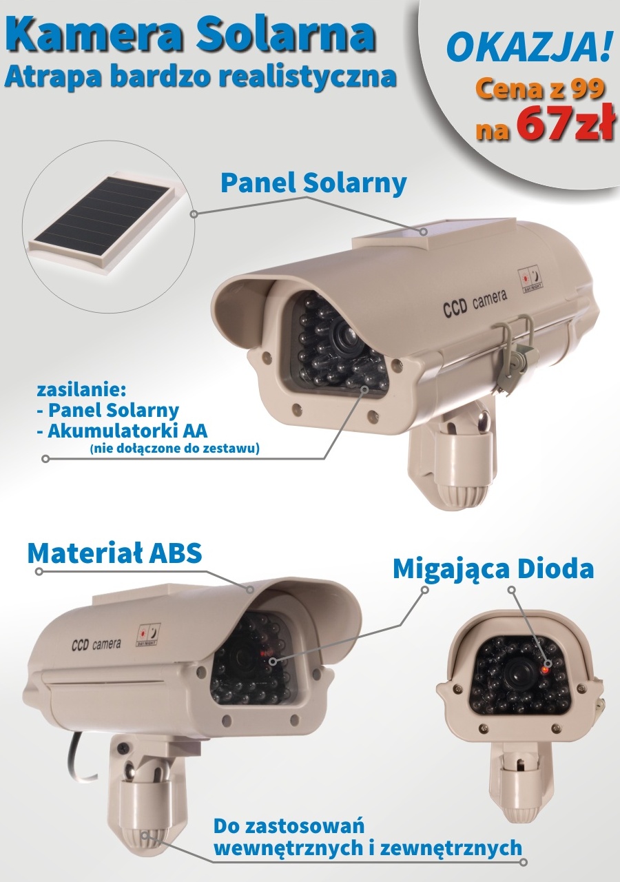 Очень точная копия оригинальной камеры с имитацией ИК-диодов и красным диодом. Качество изготовления характеризуется использованием высококачественных материалов и вниманием к деталям. Выглядит все очень реалистично, даже установщик фотоаппаратов с многолетним опытом не сможет отличить настоящая это камера или манекен. Благодаря солнечной панели вам не придется беспокоиться об аккумуляторах, поскольку они будут заряжаться от панели ежедневно.