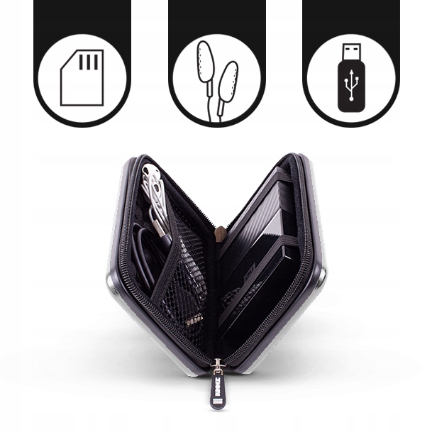 - Кейс закрывается на молнию. Внутри вы можете найти небольшой сетчатый карман, например, для USB-кабеля. Диск дополнительно закреплен двумя растягивающимися резиновыми лентами, фиксирующими его на месте. Корпус изготовлен из прочного пластика и покрыт пенопластом, покрытым тканью, чтобы еще лучше защитить ваше оборудование.