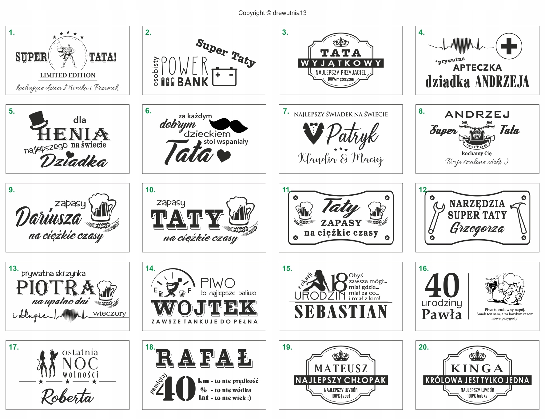 После совершения покупки в форме доставки Аллегро в разделе «Сообщение продавцу» сообщите нам номер образца гравировки, название и инструкцию, что нам следует изменить или добавить (например, у кого ).