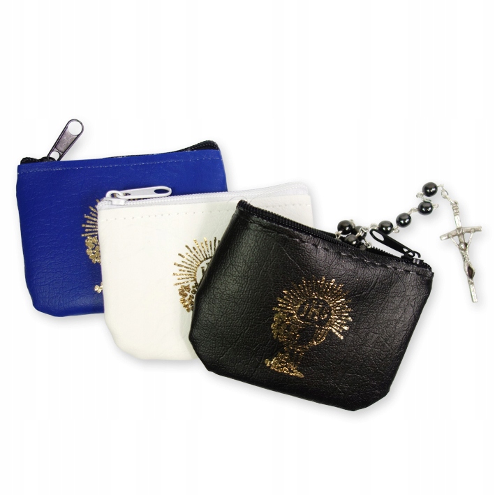Футляр для четок - на молнии Футляр для четок - доступен в трех цветах: белом, синем и черном. На каждом футляре есть евхаристическая печать золотом. Все эти чехлы закрываются на молнию. Они изготовлены из экокожи. размеры: 8,5 х 6,5 см