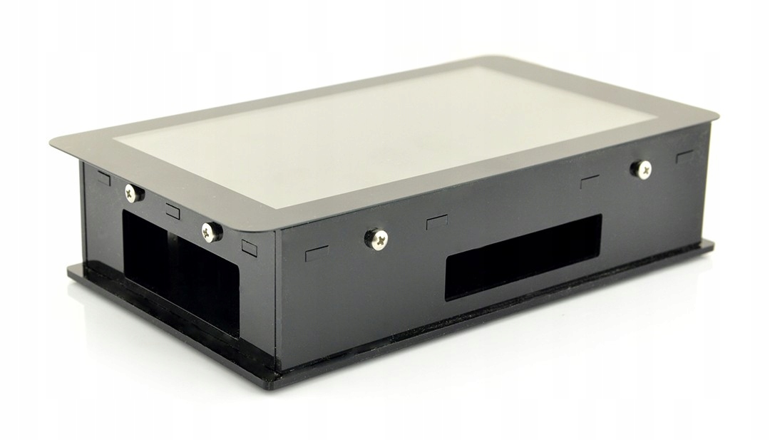 Черный чехол для миникомпьютера Raspberry Pi версий 3, 2 и B+ и официального сенсорного экрана DSI диагональю 7 дюймов и разрешением 800 x 480 пикселей. Внешние размеры 185 х 110 х 45 мм.