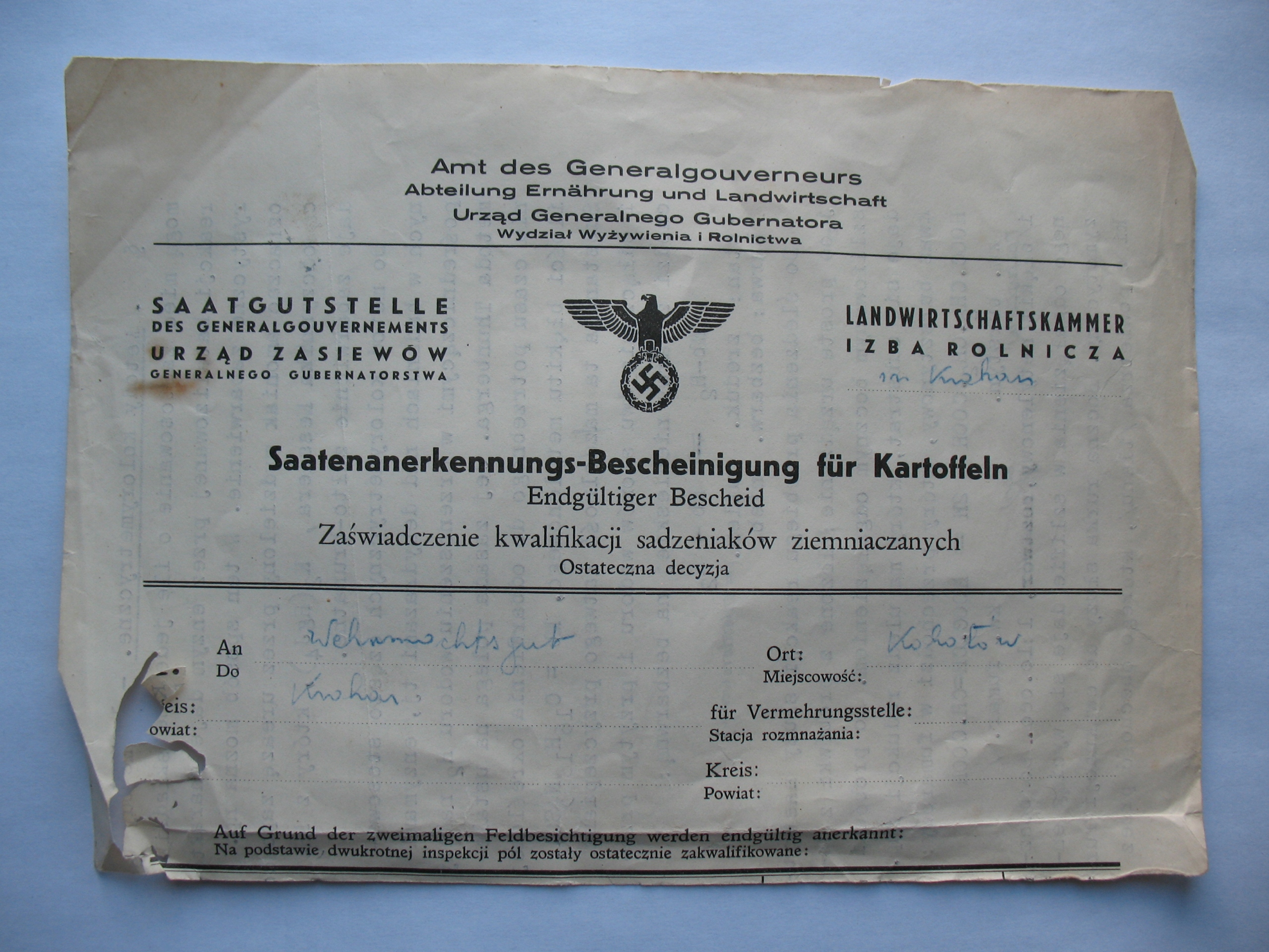 G. GUBERNIA KRAKAU URZĄD ZASIEWÓW ZAŚWIADCZENIE KWALIFIKACJI ZIEMNIAKÓW