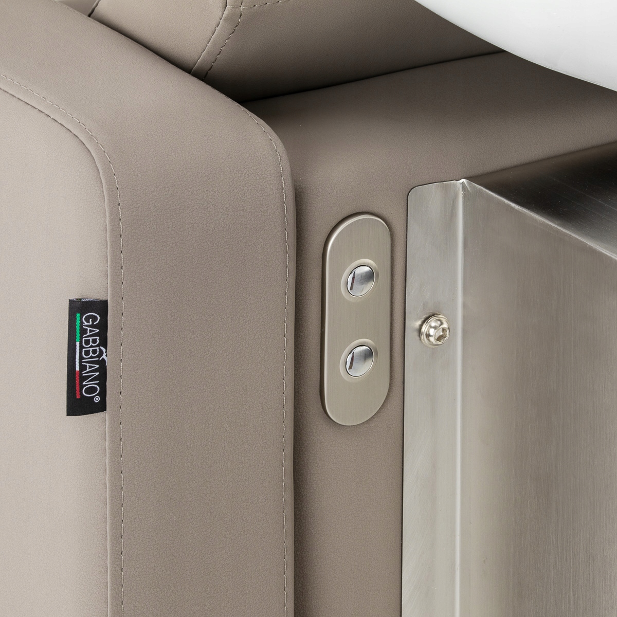 Washing Wash Gabbiano Sylvia был разработан для комфортных процедур выполнения Carre или предоставление клиенту удобное положение во время более длинных процедур. он привлекает глаза с простотой и геометрической формой , а перпендикулярные линии сиденья и подлокотников придают ему современный характер. Задняя часть, расположенная под оптимальным углом, способствует совершенной поддержке позвоночника . Правильно профилированное сиденье, заполненное прочной пеной, обеспечивает высокопоставленное использование , а водонепроницаемые подлокотники позволяют правильное расположение плеч клиента . Синтетическая кожаная крышка в оттенках бежевого гарантирует многолетнее прочность и простоту очистки . Элегантный, минималистский внешний вид автомобильной стирки придает интерьеру уникальное выражение. Набор включен