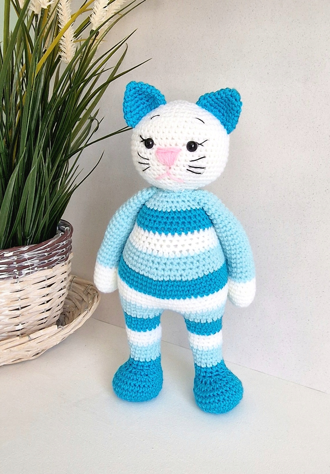 Китти, полностью изготовленный вручную от акриловой пряжи и наполненной силиконовым шаром. У него есть безопасные зажимы изнутри. Игрупку можно вымыть вручную в 30 ° С.