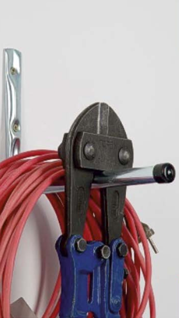 Прямые стальные крючки для подвешивания небольшого садового инвентаря, инструментов, необходимых в гараже, или спортивного инвентаря.