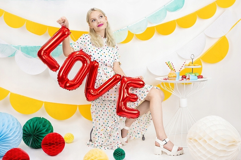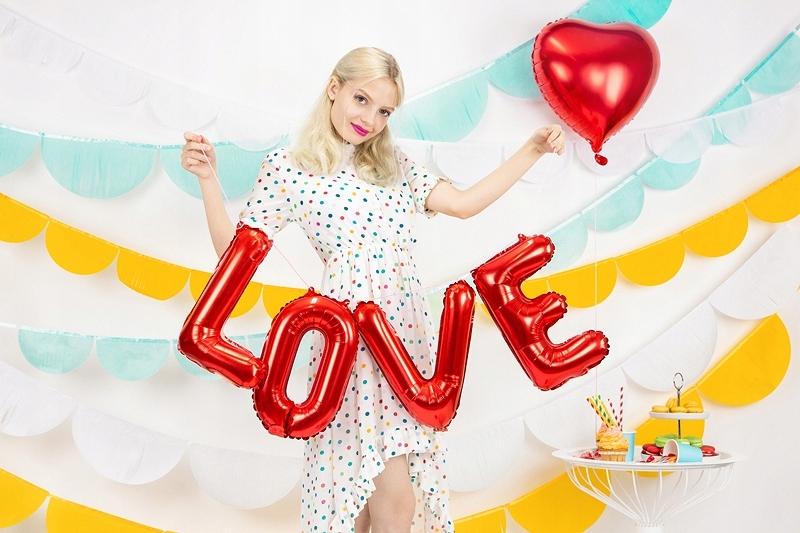 - Воздушные шары из металлизированной фольги, образующие слово «Любовь» красного цвета, размеры примерно 140 х 35 см. Буквы имеют вверху глазки, благодаря чему их можно соединить в одну гирлянду. Воздушные шары можно надувать многократно и имеют самозакрывающийся клапан.