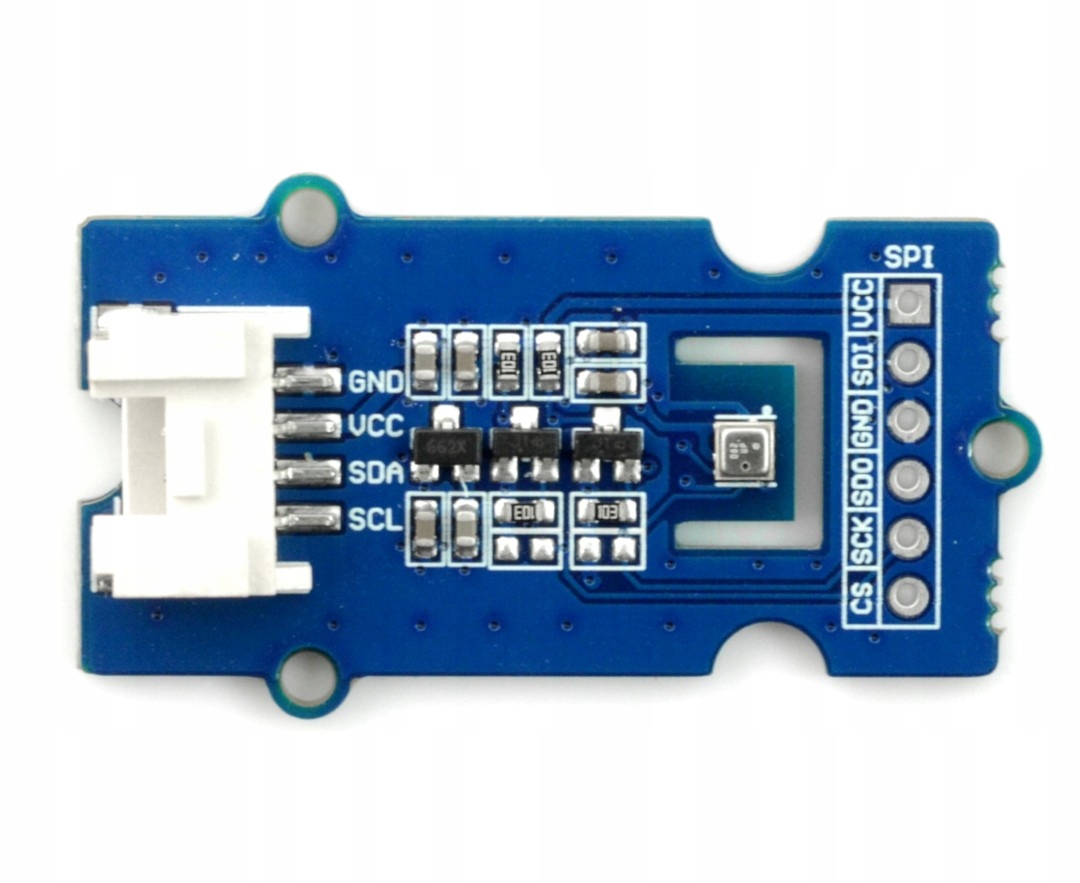 Модуль Grove, оснащенный датчиком влажности, температуры и давления с питанием от 3,3 до 5 В, интерфейсами I2C и SPI. Диапазон измерения: температура: от -40 °C до 85 °C, влажность: от 0 до 100 % относительной влажности, давление: от 300 до 1100 гПа. В комплект также входит кабель, адаптированный к накладке Seeedstudio Base Shield v2.0.