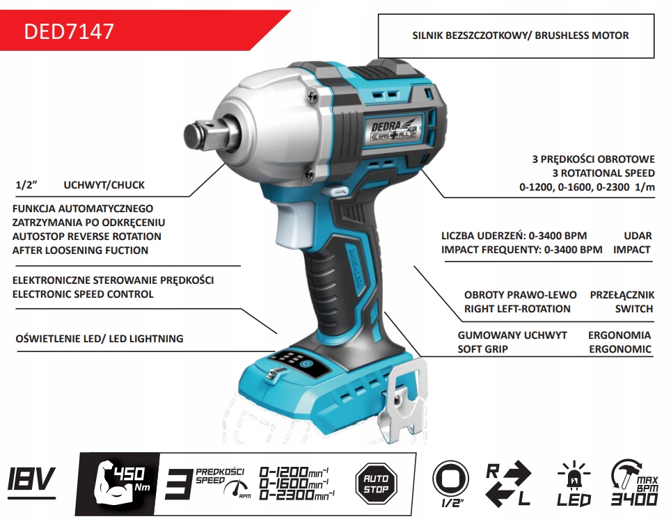 Характеристики беспроводного ударного гайковерта 18 В DEDRA SAS+ALL DED7147: