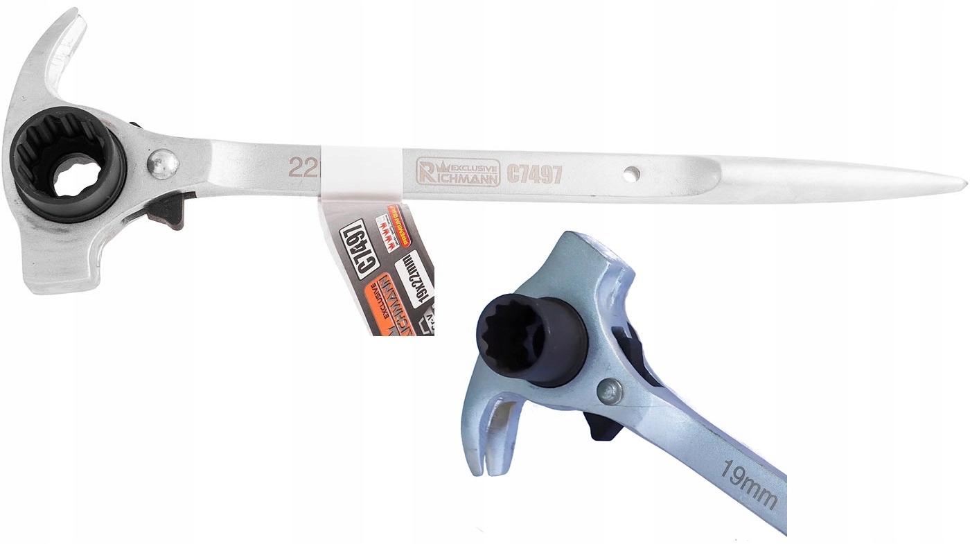 Двойной ключ на 12 точек с храповым механизмом для строительных лесов размерами 19 х 22 мм.