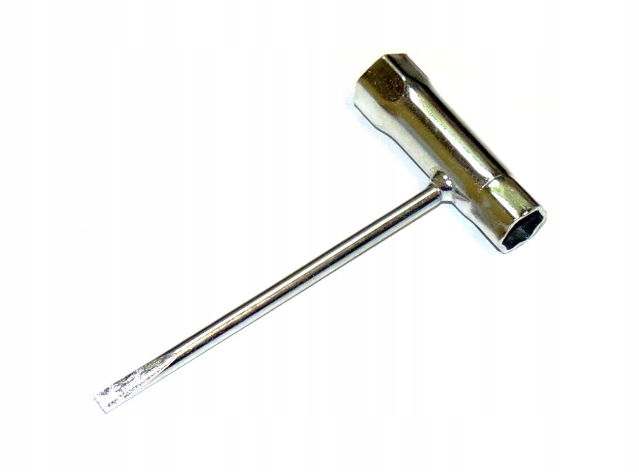 С одной стороны он имеет выступ. ушко «16» позволяет выкрутить, например, свечу зажигания NGK CMR6H или BOSCH USR7AC, а с другой стороны имеется отверстие «13», которое без Проблема, мы можем открутить, например, заглушки в некоторых моделях устройств. Дополнительно в ключе имеется плоская отвертка, позволяющая, например, правильно натянуть цепь.