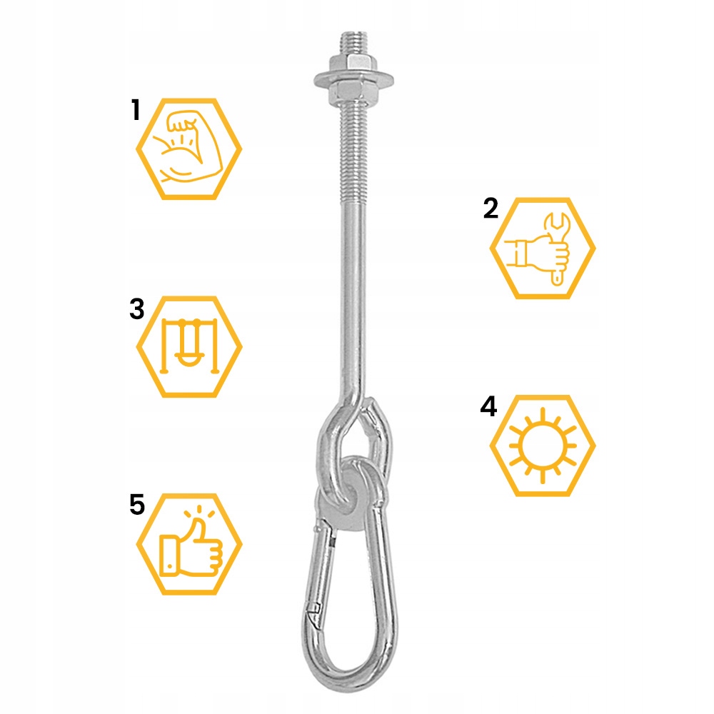 Свинг -крюк с карбинией для глаз является частью структуры, используемой для соединения двух элементов качания или гамака во время сборки. Это чаще всего используется в проектах по работе или в саду.