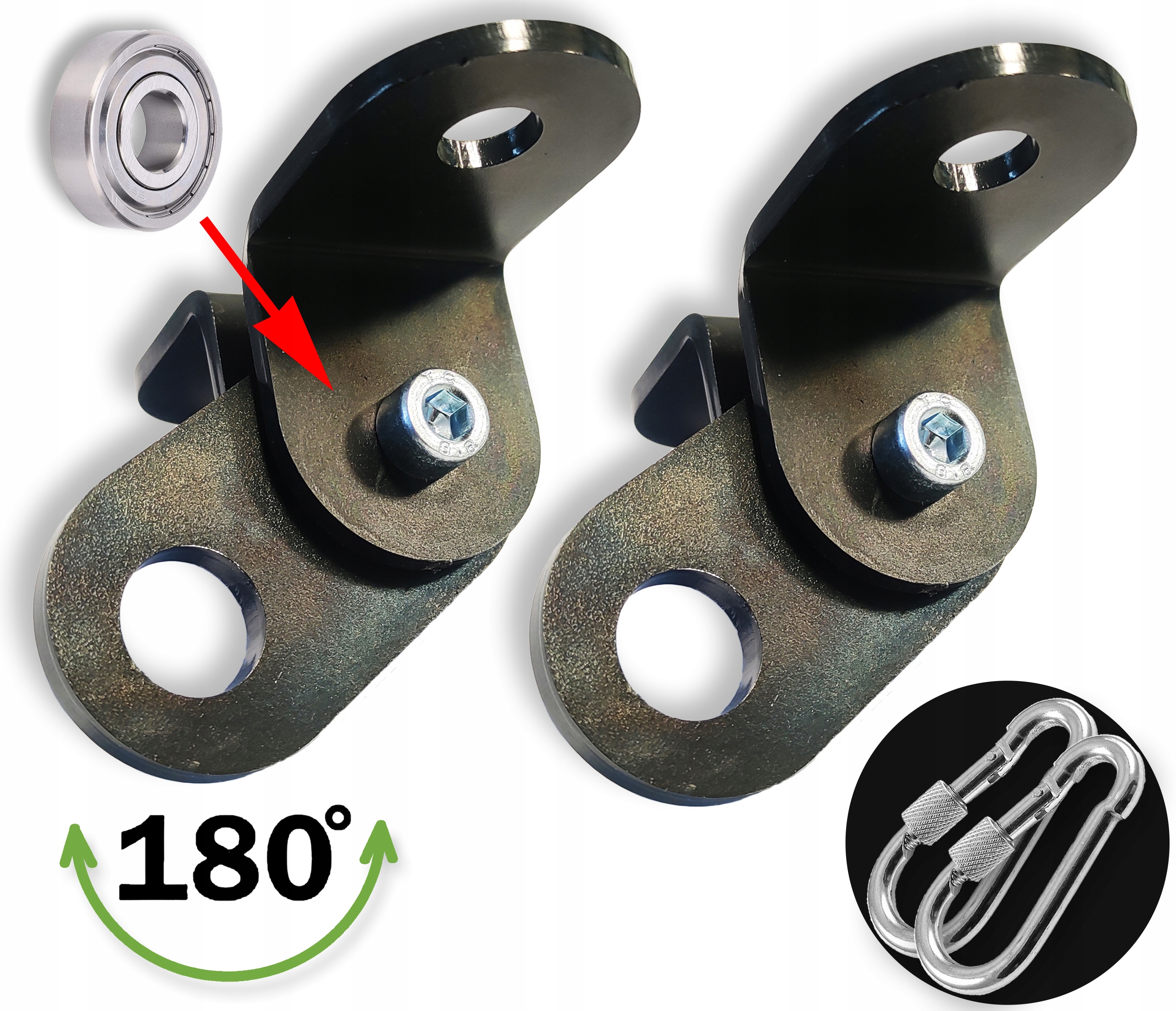 На этом аукционе представлены 2 шарикоподшипниковых качельных крепления с двумя отверстиями диаметром 12,5 мм + 2 карабина диаметром 8 мм с предохранителем