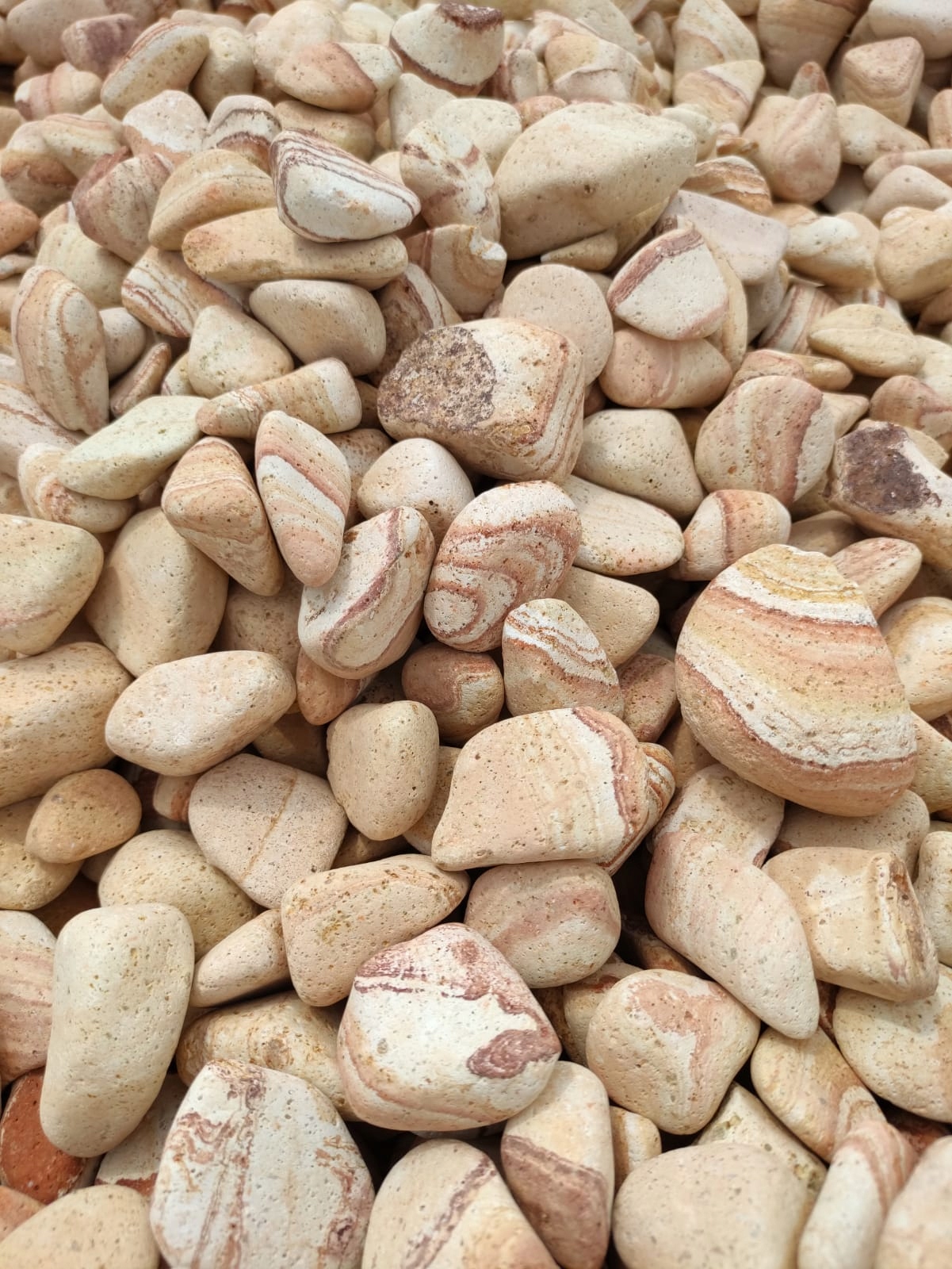 Rainbow Pebble — натуральный камень бежевого цвета с уникальным узором. Используется как декоративный элемент в альпинариях, аллеях, дорожках, бордюрах вокруг дома; более толстые фракции используются в габионах. Камень не промывается!