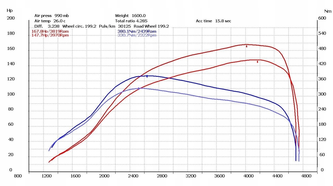 Эффекты чип-тюнинга можно наблюдать на диаграмме ниже после измерения мощностинапример. на динамометрическом стенде