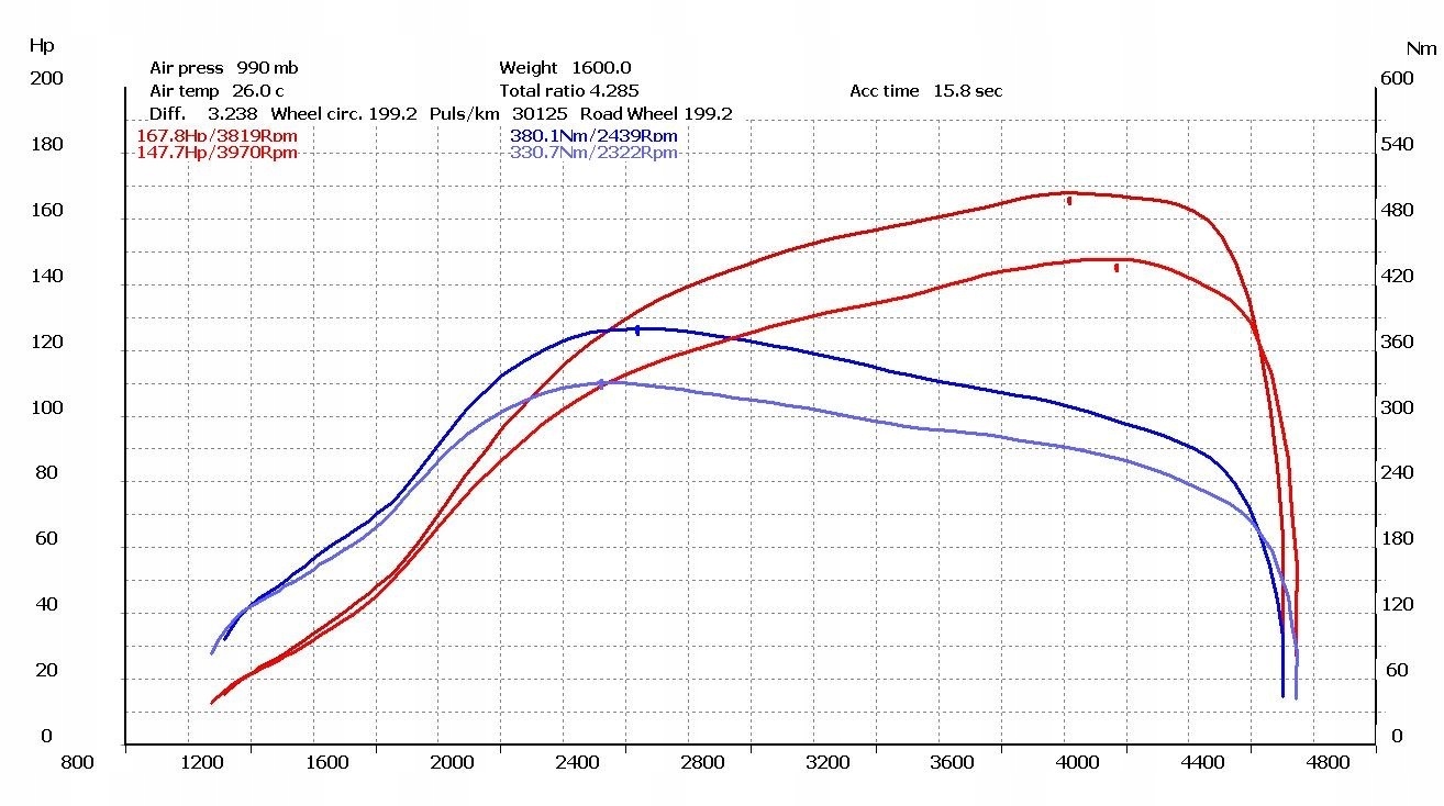 Эффекты чип-тюнинга можно наблюдать на диаграмме ниже после измерения мощностинапример. на динамометрическом стенде