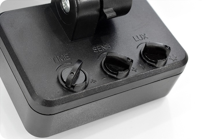 Сумеречный датчик настраивается с помощью ручки LUX. С ее помощью выбираем, насколько чувствителен должен быть датчик в случае дневной и ночной работы. Ручка расположена рядом с двумя другими ручками.