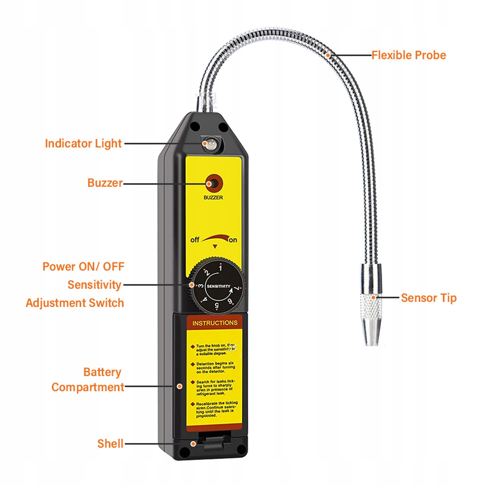 4. Надежность и долговечность: детектор утечки хладагента тщательно разработан и изготовлен из прочного АБС-материала, что обеспечивает длительный срок службы.