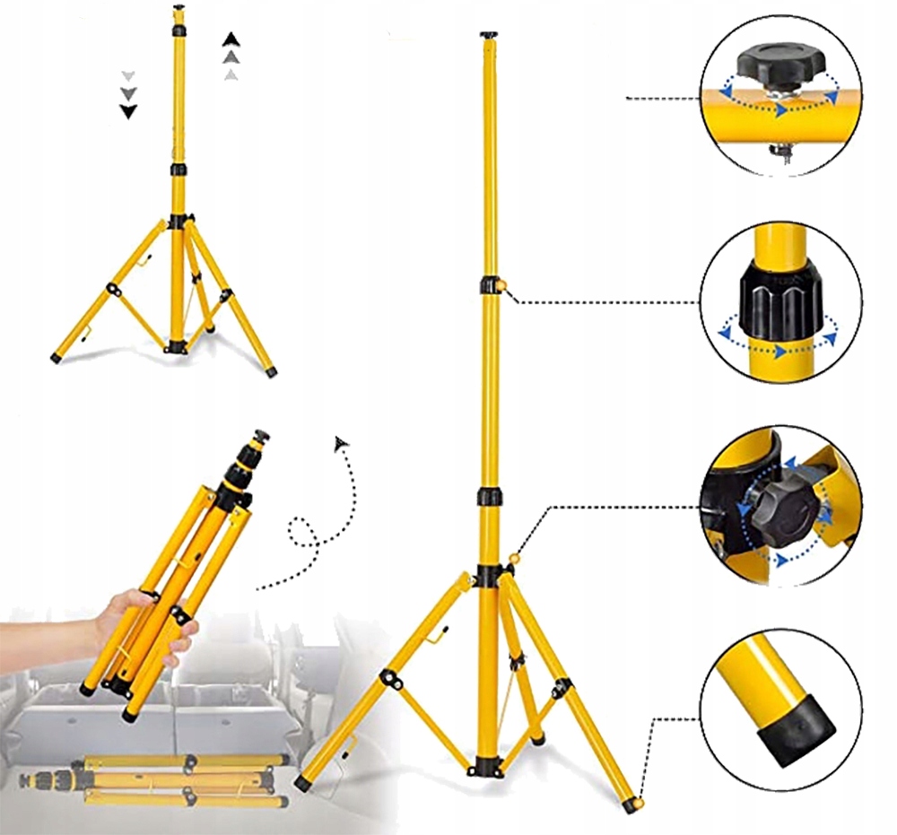 Универсальная телескопическая рабочая стойка предназначена в основном для прожекторов и рабочего освещения. Незаменим на стройках, в мастерских и для всех видов наружных работ.
