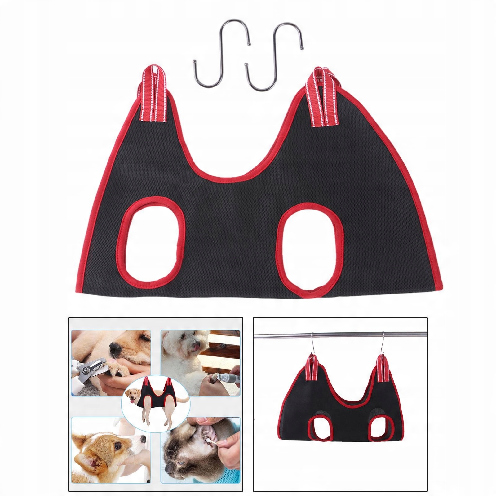 Просто поместите ноги собаки в отверстия, оберните и повесьте на крючки S. После использования гамака-помощника для кошек/собак, промойте его холодной водой и высушите естественным путем
