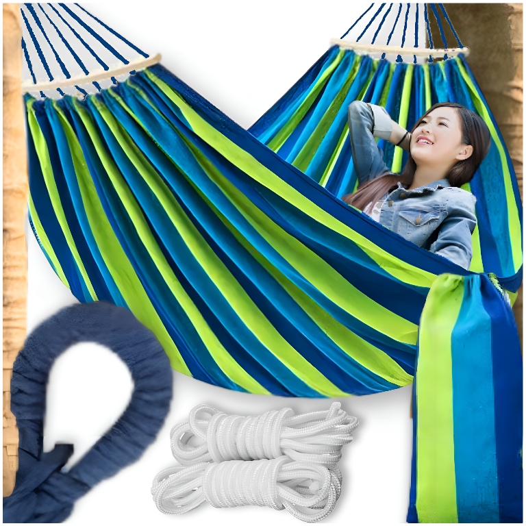 Двойной гамак с повязкой на голову — это то, что должно быть в каждом саду! Изготовлен из высококачественной, воздушной ткани и гарантирует безопасность бездельничать на свежем воздухе в жаркие дни или теплые вечера. Большая поверхность материала позволяет разместить до двух человек, поэтому вы можете использовать его с любимым человеком, ребенком или кем-либо еще по вашему желанию. Деревянное оголовье предотвращает запутывание струн, что уменьшает риск их износа. Кроме того, оно удерживает гамак в развернутом состоянии — предотвращает его скручивание. скручивание.