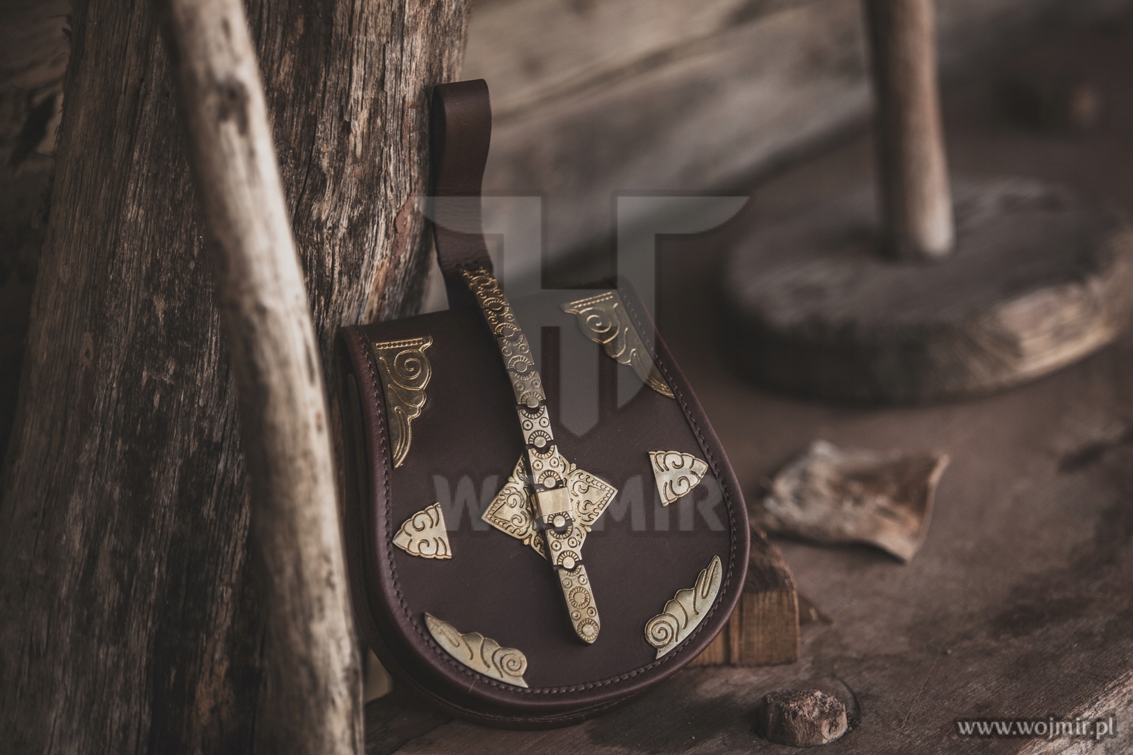 Аутентичная раннесредневековая сумка из высококачественной коровьей кожи толщиной 3 мм с 18 бронзовыми деталями и центральным ремнем для подвешивания. Он точно воспроизводит историческую находку.