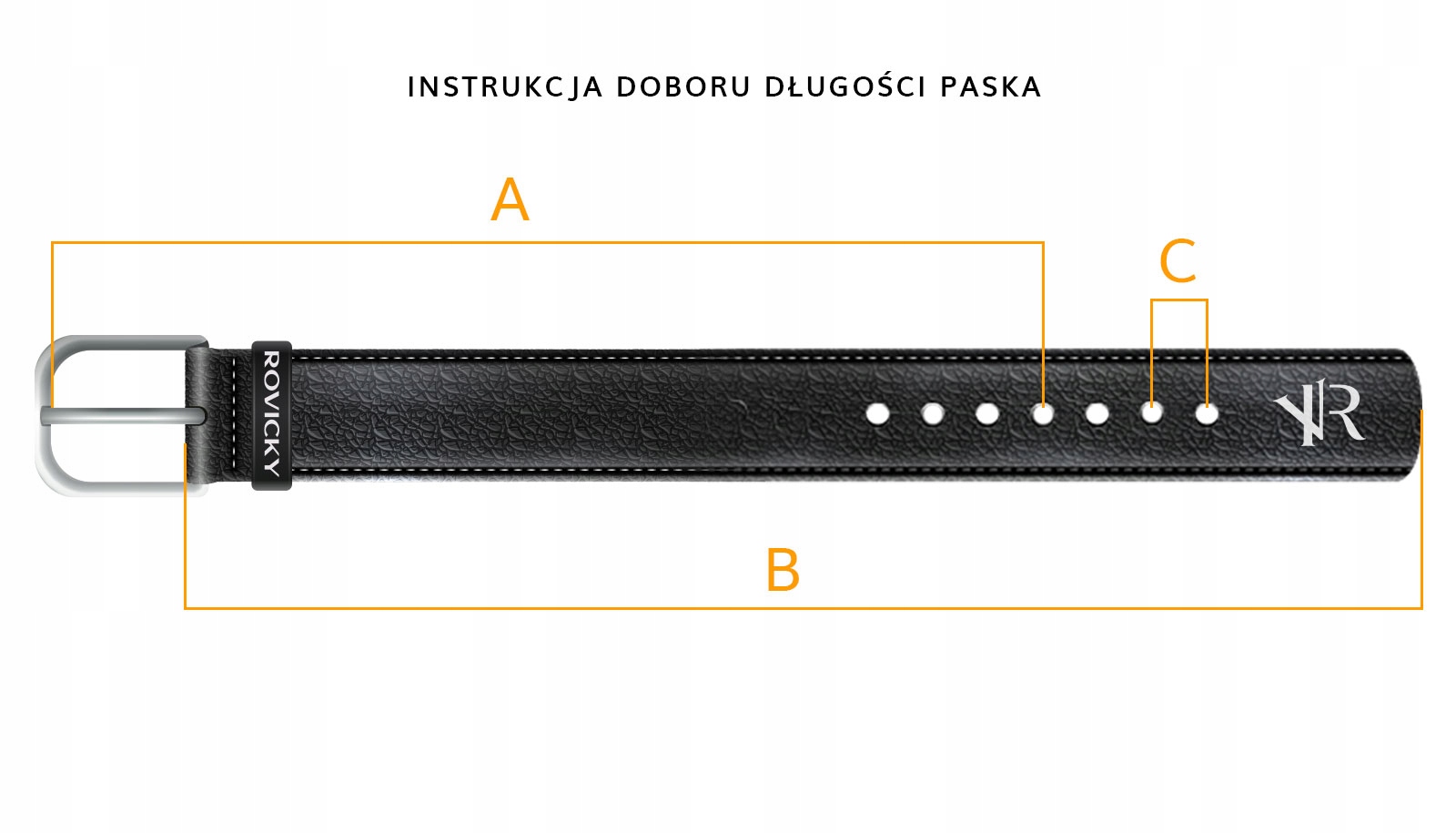 B — длина ремня без пряжки (это значение вы выбираете на Allegro рядом с кнопкой покупки)