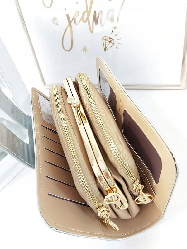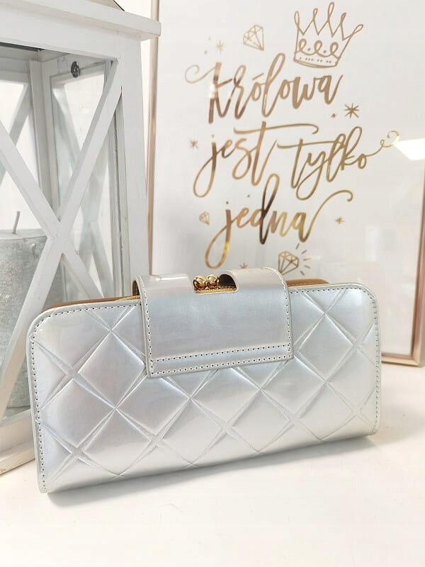 Сумка-кошелек 2-в-1 из прочной блестящей экологической кожи серебристого цвета.