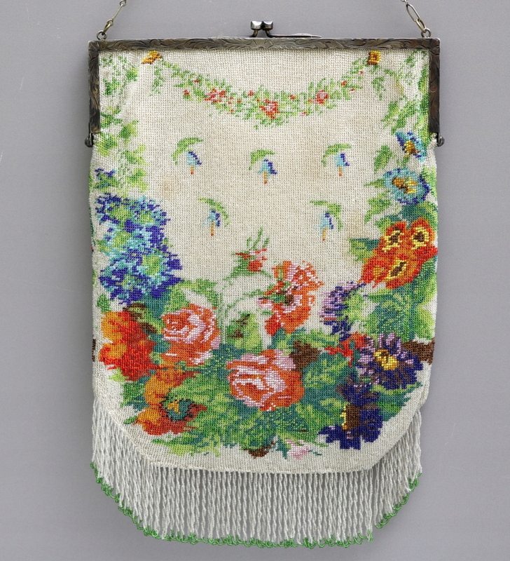 Оригинальная расшитая вручную бисером сумка рубежа XIX и XX веков с двумя дополнительными карманами внутри и кошельком.