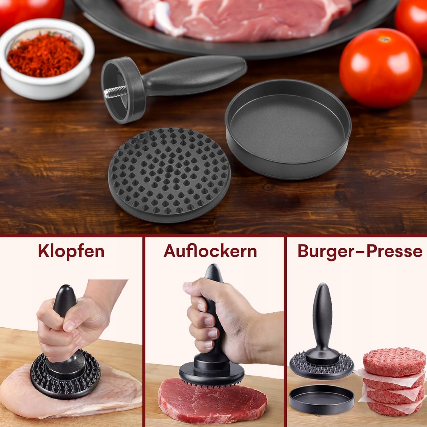 • Плоская сторона - она отлично подходит для выравнивания и уплотнения мяса, например, Для свиных отбивных и стейков.