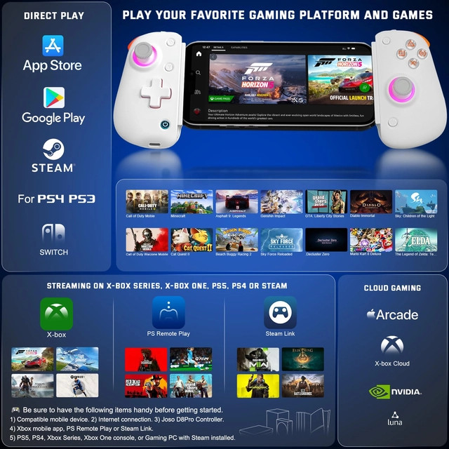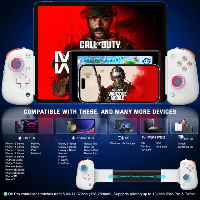 - Служба более крупных игровых устройств: Контроллер Android/IOS может быть продлен до длины 128-289 мм (5,03-11,37 дюйма), а iPad/планшет на 12-дюймовый и другие, такие как iPad Pro 12,9 IPAD). Поддерживаемый контроллер Games D8 поддерживает прямую игру на iOS/Android/PC/PS4/Switch, такой как COD Mobile/Genshin Excte/GTA и другие. Поддерживает облачные игры, такие как Game Pass (Xbox Cloud)/Geforce Now Ect. Supports streaming transmission on PS4/PS5/Xbox Series/Xbox One and PC via the mobile application PS Remote Play/Xbox/Steam Link on devices with Android/iOS, simply PS/Xbox/PC console is connected For power supply, and the Internet and enabled, you can use your p p Such as iPad, iPhone 15/14/13/12/11/8/6/6/XS, Series Galaxy S23/S22/S21/S20, TCL/Huawei/OPPO и другие мобильные устройства