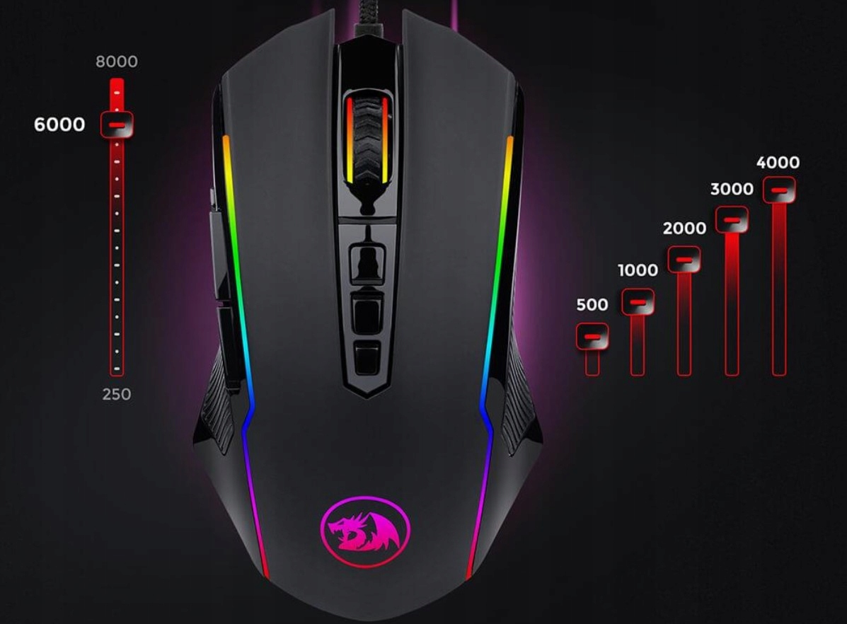 - Для различных целей игровая мышь имеет информацию о 5 точках на дюйм с цветными индикаторами, включая 500/1000/2000/3000/4000 точек на дюйм . Дополнительное значение DPI можно задать от 250 до 8000 с помощью программного обеспечения.