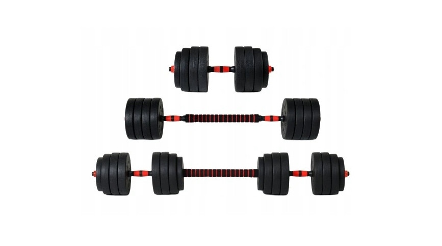 Благодаря разъему гантеля, прикрепленного к набору, вы можете быстро преобразовать штангу. Это решение допускает комплексную подготовку дома