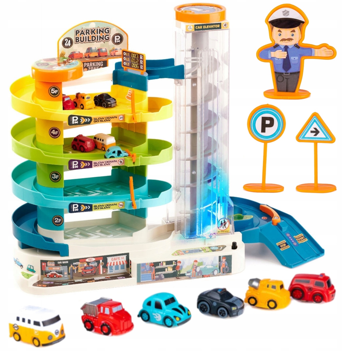 Многоуровневая парковка с горкой, оборудованная электрическим лифтом, поднимающим автомобили на высший уровень.