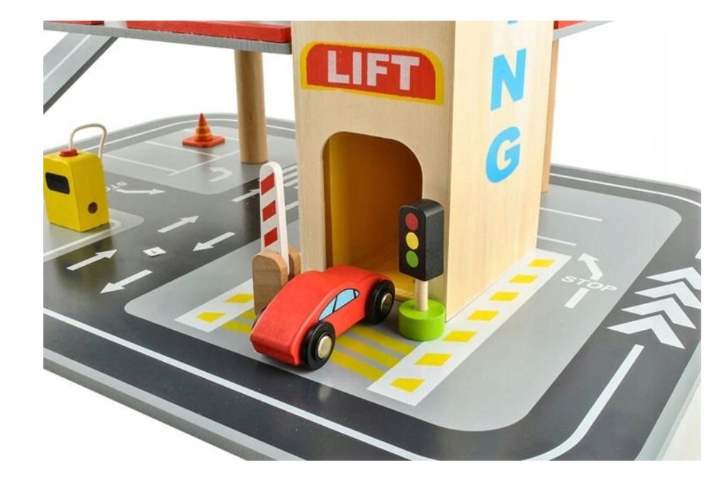 включает в себя многоуровневую автостоянку с лифтом, дорожные знаки, 2 автомобиля с дистрибьютором топлива, вертолет с посадкой