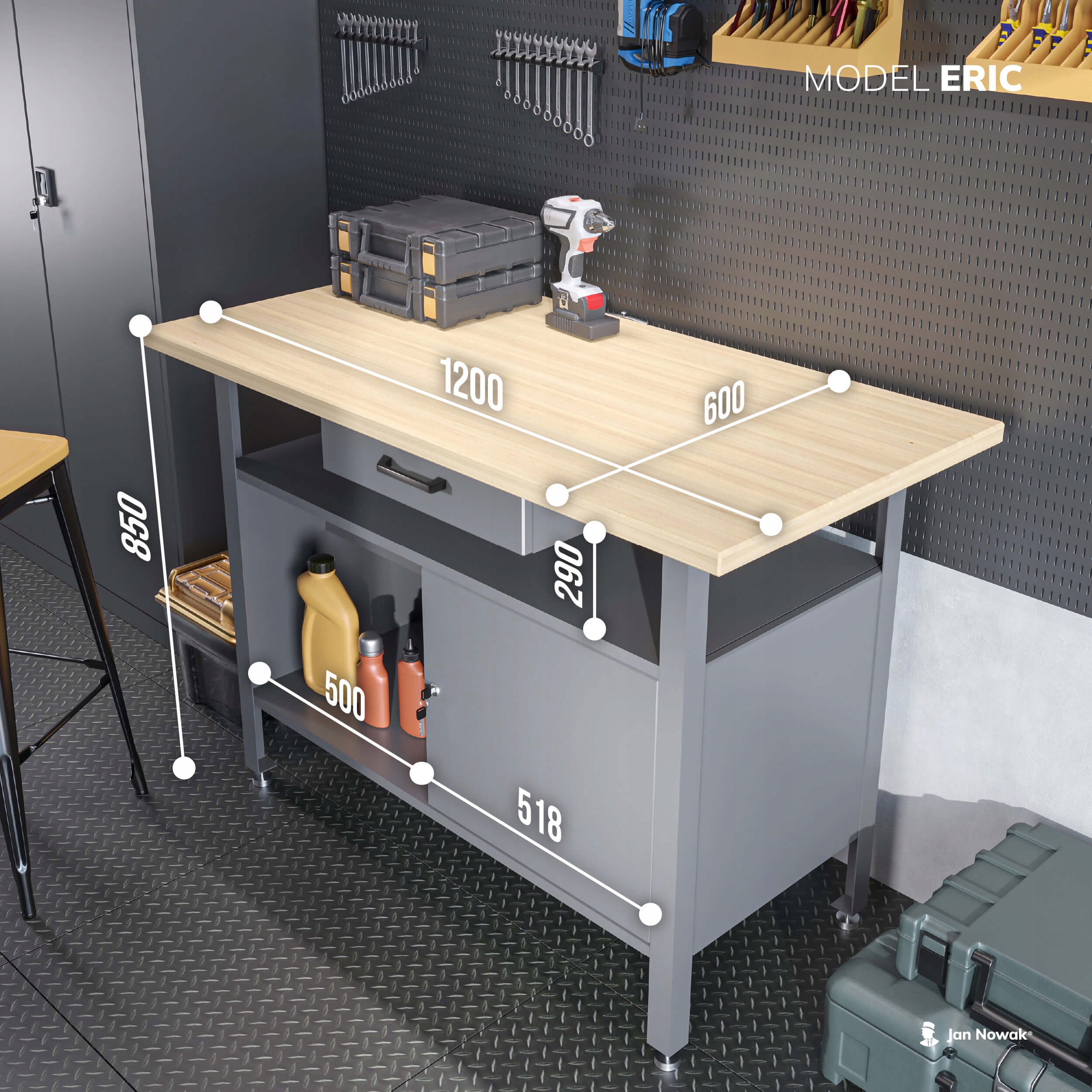 Хорошо организованная мастерская – залог комфортной и эффективной работы, как профессионалов, так и любителей домашних мастеров. Верстак ERIC от Яна Новака представляет собой сочетание удобной и прочной столешницы из ламинированной плиты МДФ и прочной стальной конструкции, которая предлагает целых 4 способа хранения инструментов и других предметов, необходимых для работы.