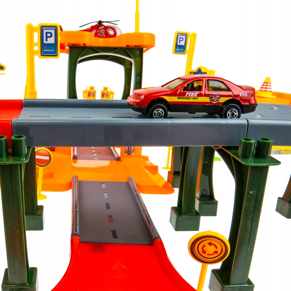 На многоэтажной парковке можно разместить множество игрушечных машинок. На парковке много подъемов, спусков и поворотов, а также туннель.