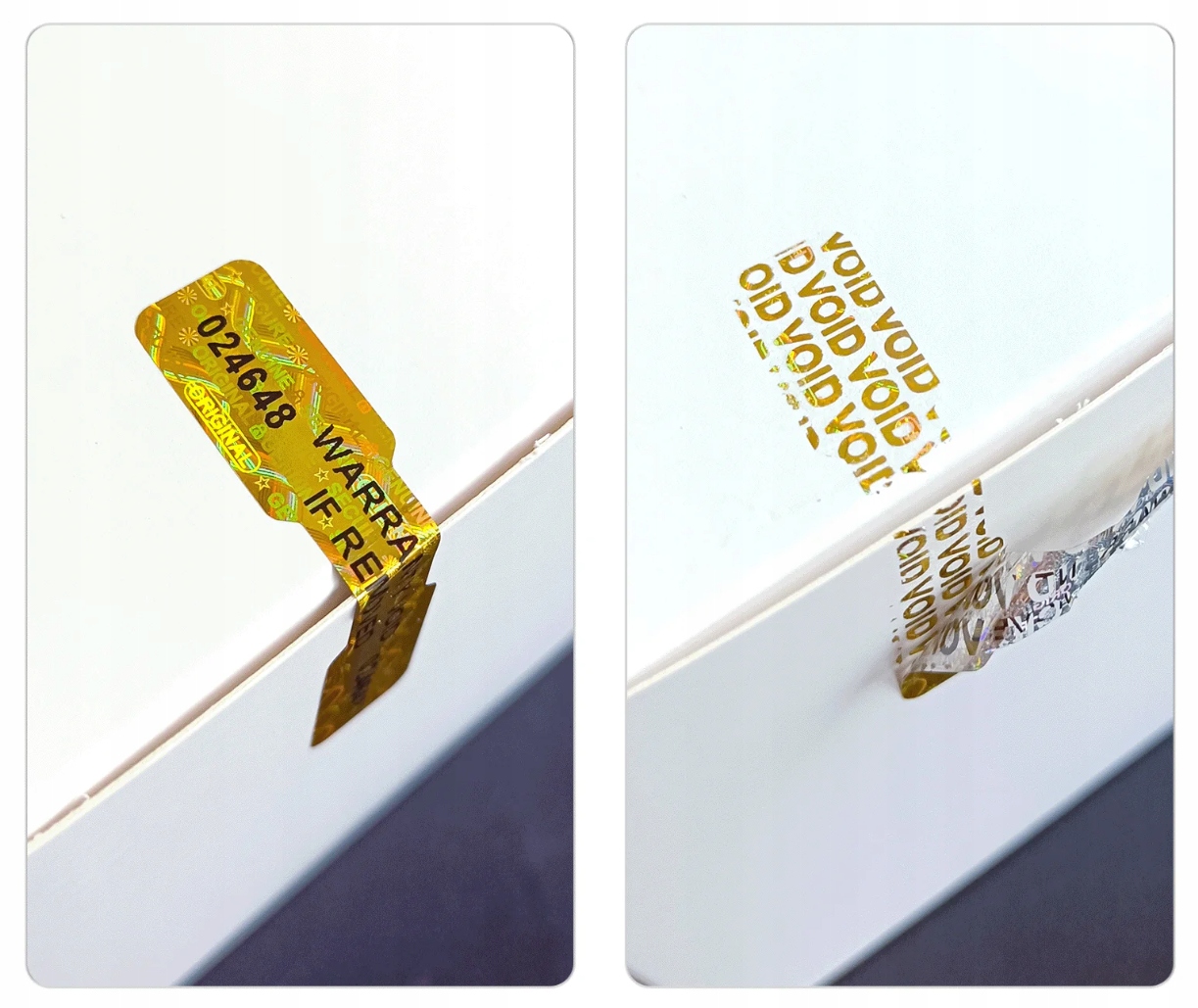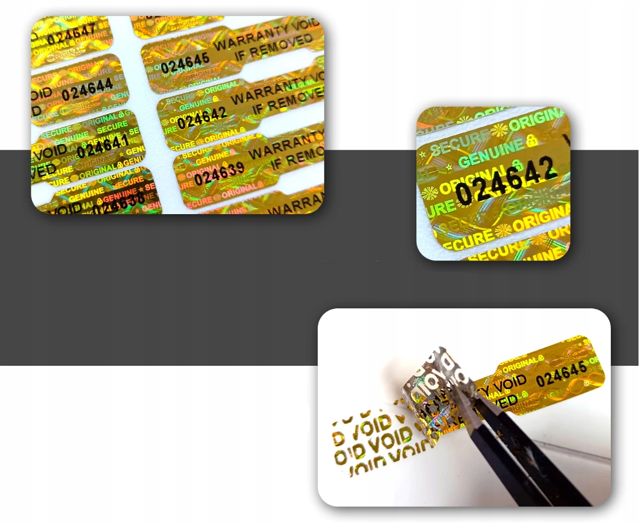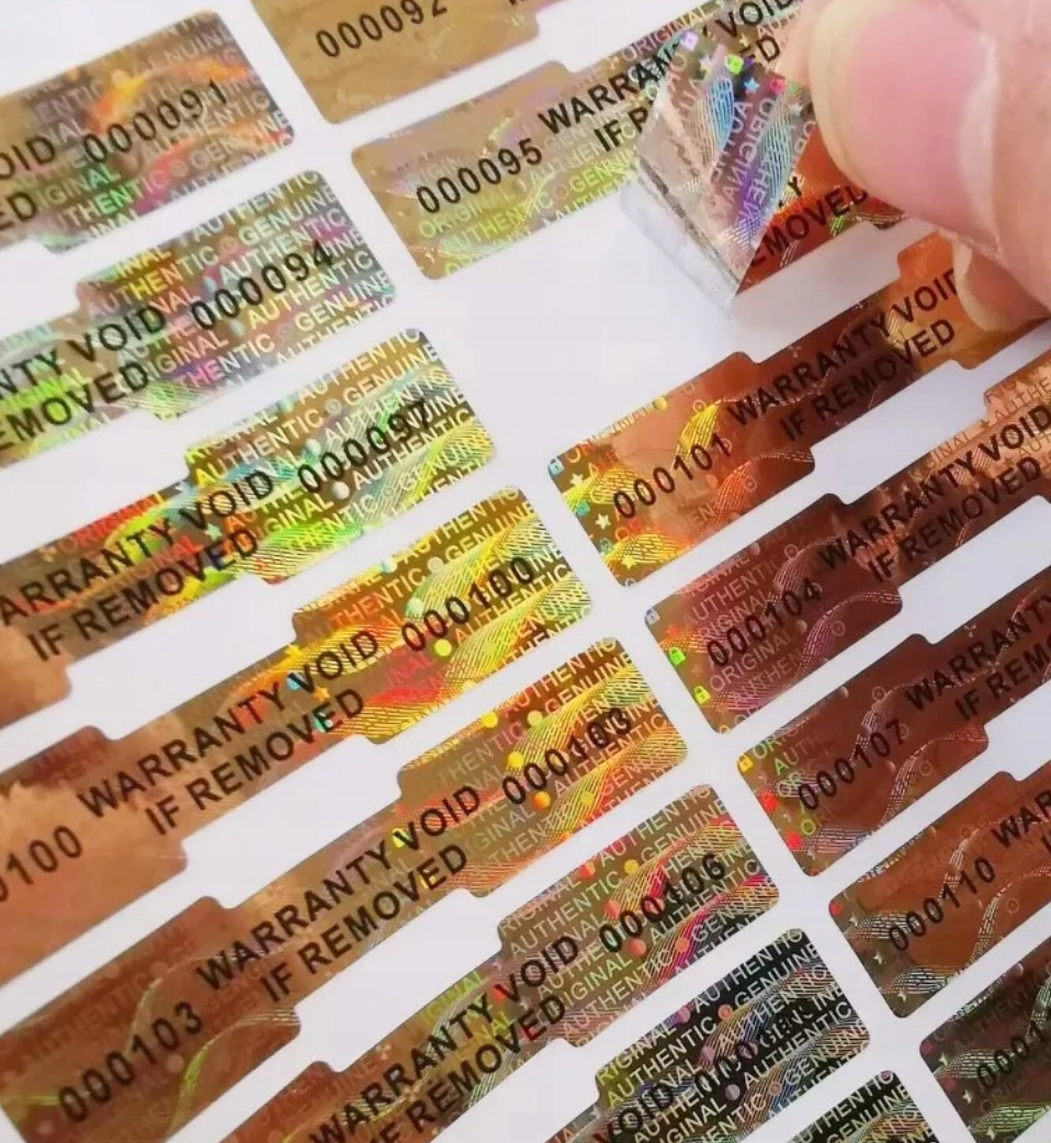 Голографические уплотнения - лучший способ обеспечить продукты. Каждое уплотнение имеет двойное и индивидуальное, другое 6-значное и уникальное число, которое можно использовать в качестве числа заводов продукта, что дает ему индивидуальное обозначение. Благодаря печатям вы избежите нечестных жалоб.