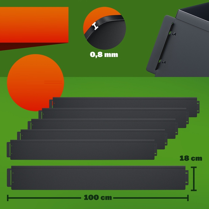 металлическая граница помогает стильно вырезать цветочные кровати, отдельные газоны и нежелательные растения вдали от скидки. Инструменты с использованием инновационной системы плагинов. В зависимости от ваших потребностей, элементы могут быть установлены под углом 90 градусов или гибко согнуты. Край изготовлен из оцинкованной стали, что делает их устойчивыми к погодным условиям, ржавчине и коррозии. Обитые края элементов предоставляются стильными акцентами и заказом в цветочных скидках. Набор включает в себя соответствующие садовые перчатки - идеально подходит для расположения границ и других садовых работ.
