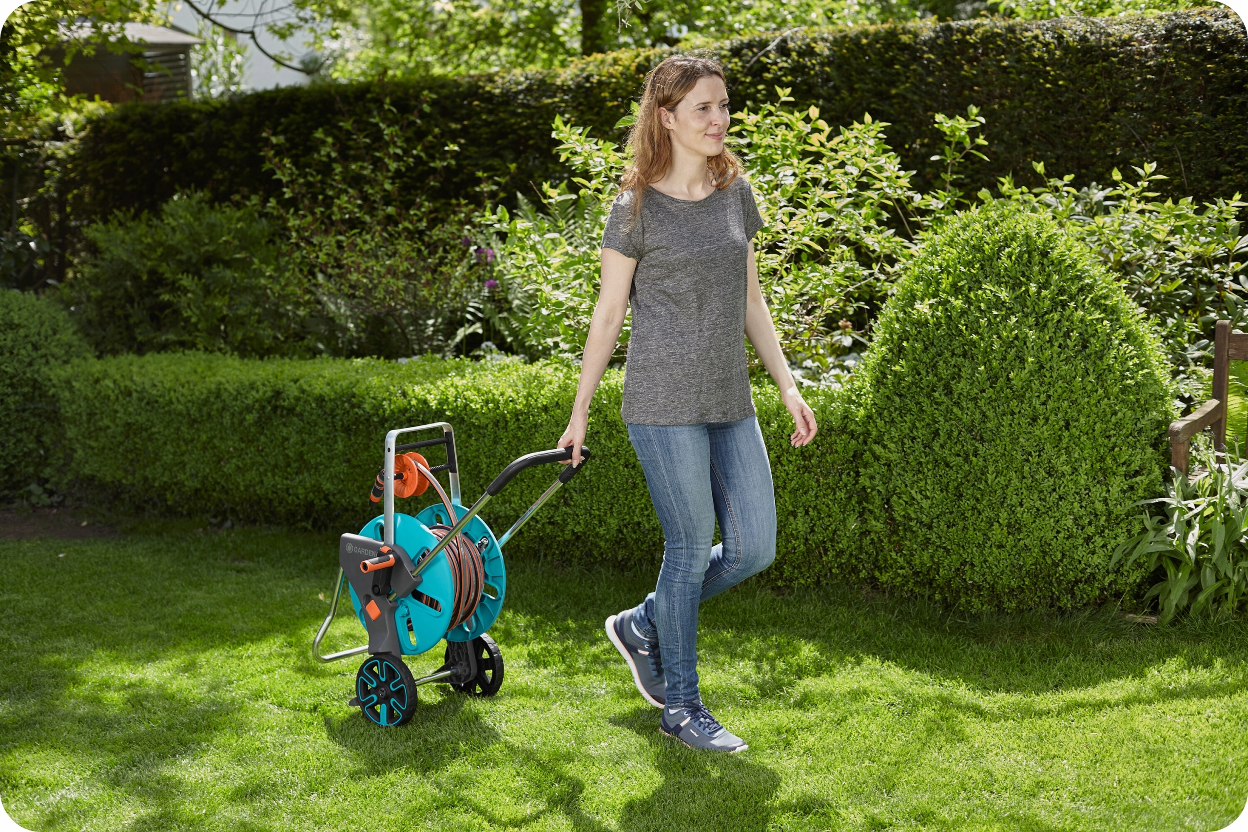 Gardena cleverroll m Easy - коляска оснащена гидом, который облегчает ровную катание змеи без запутывания и системы удара и стойки, обеспечивающей стабильность даже на неровной земле. Защита от утечек и мороза гарантирует комфорт использования в течение года, а мягкая ручка и большие колеса позволяют удобно двигаться по саду. Продукт, совместимый с оригинальными элементами системы Gardena, идеально подходит для полива больших садов и поддержания порядка.