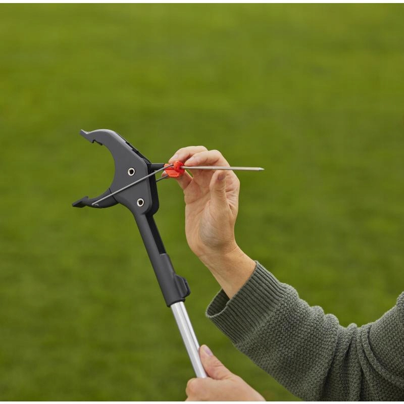 Захват можно использовать для подъема мусора, садовых отходов и труднодоступных предметов в удобной для спины конструкции. способ. Сначала прикрепите насадки для сгребания, затем нажмите кнопку и поверните головку захвата — так вы сможете легко и эргономично сгребать листья. Для удаления грязи с затвердевших поверхностей можно использовать металлический скребок. Шашлык из нержавеющей стали позволяет нанизывать гнилые фрукты, не пачкая рук.