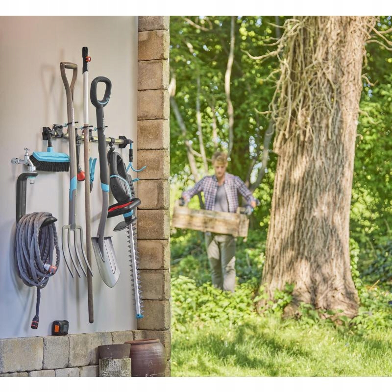 Держатели подходят для хранение тяжелых инструментов, таких как лопаты, инструменты комбисистемы GARDENA или элементы оригинальной системы GARDENA. Универсальный крючок позволяет хранить такие инструменты, как кусторезы и воздуходувки.