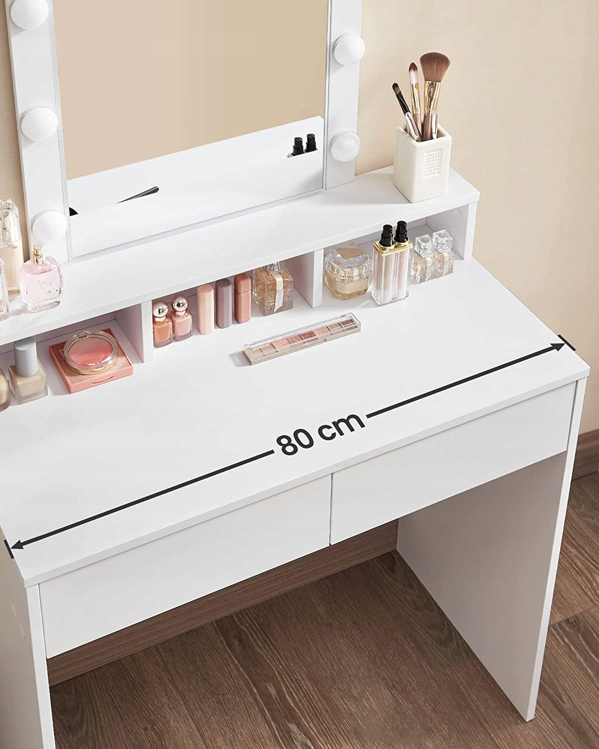 Туалетный столик с зеркалом с подсветкой, белый, с выдвижными ящиками. Он характеризуется солидным и детальным исполнением. Идеальный предмет мебели для людей, которые ценят функциональные и элегантные решения. Благодаря универсальному дизайну туалетный столик впишется как в классическую, так и в более современную обстановку, обогащая интерьер и добавляя ему оригинальности. При ее производстве использовались материалы высочайшего качества, что делает ее отличным вариантом для тех, кто ищет прочную и надежную мебель, которая прослужит долгие годы. Решая купить туалетный столик, вы выбираете проверенный товар от признанной компании, который не разочарует ваших ожиданий, позволяя наслаждаться комфортом и функциональностью его использования каждый день. Лампочки при включении имеют холодный цвет.