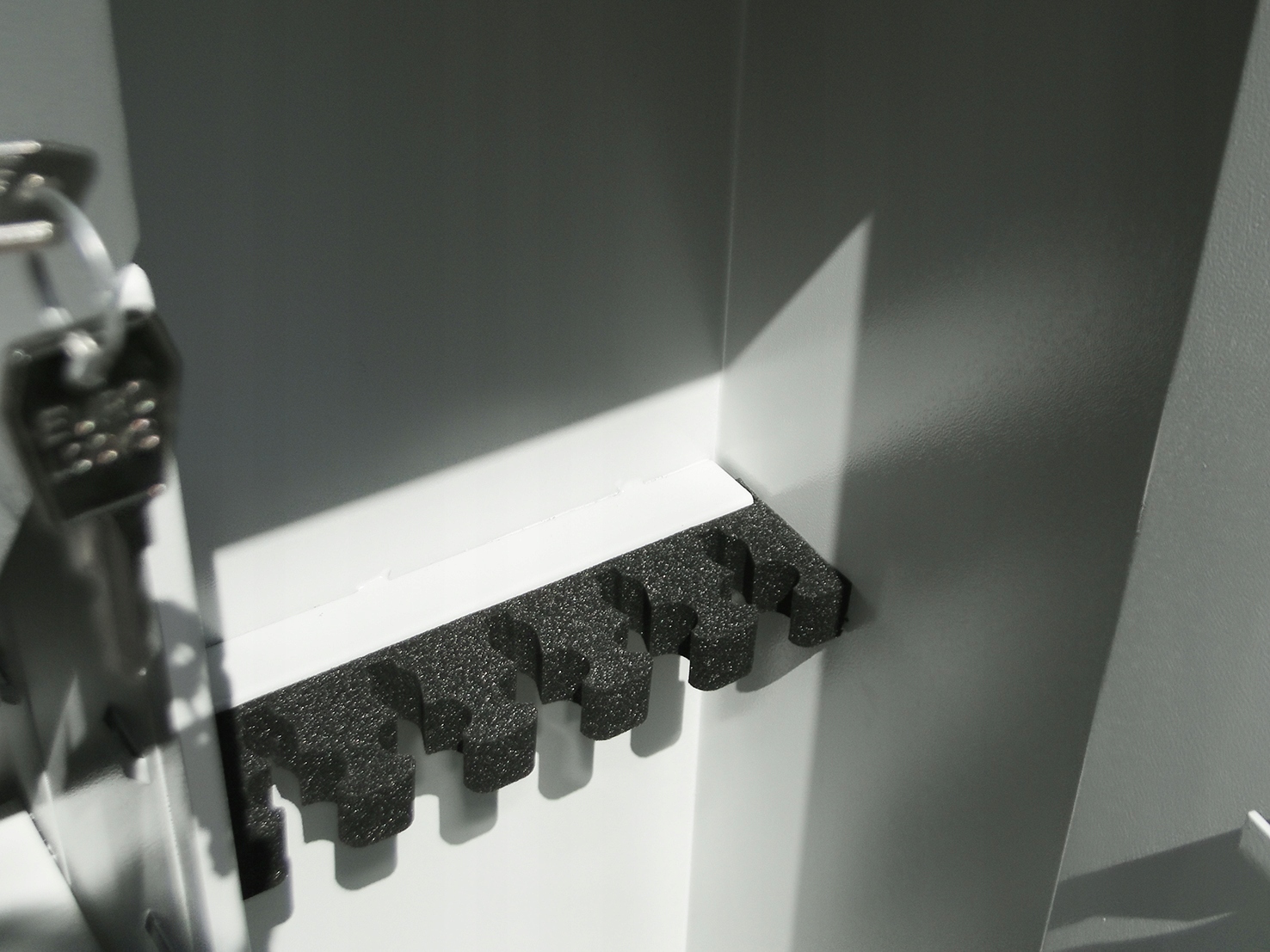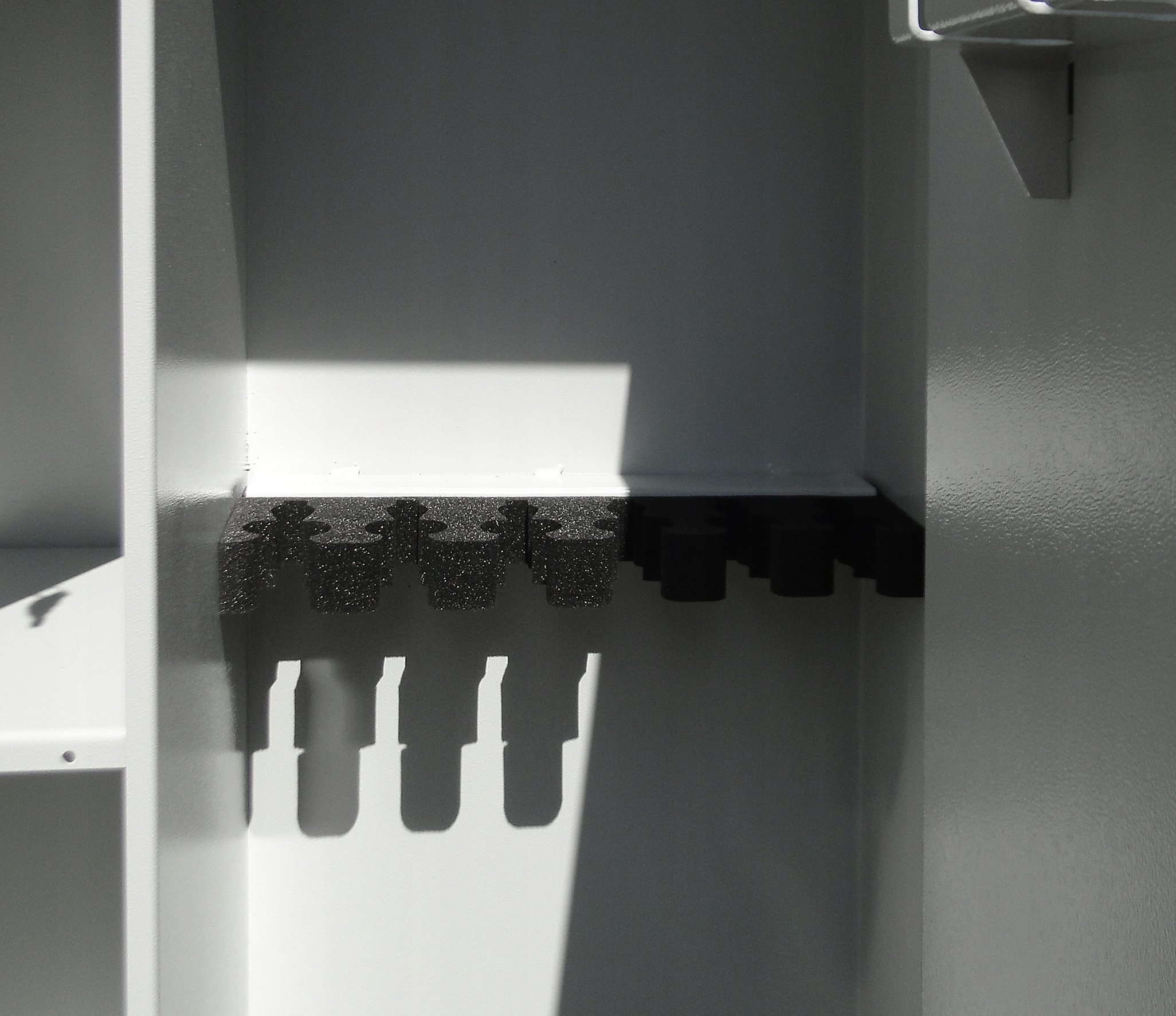 Кроме того, сейф был разделен на две камеры. Один из них оснащен 6 ручками для оружия пены. Во втором есть 2 полки и сокровища, закрытые с отдельным ключом. Дно было выложено с лайнером.