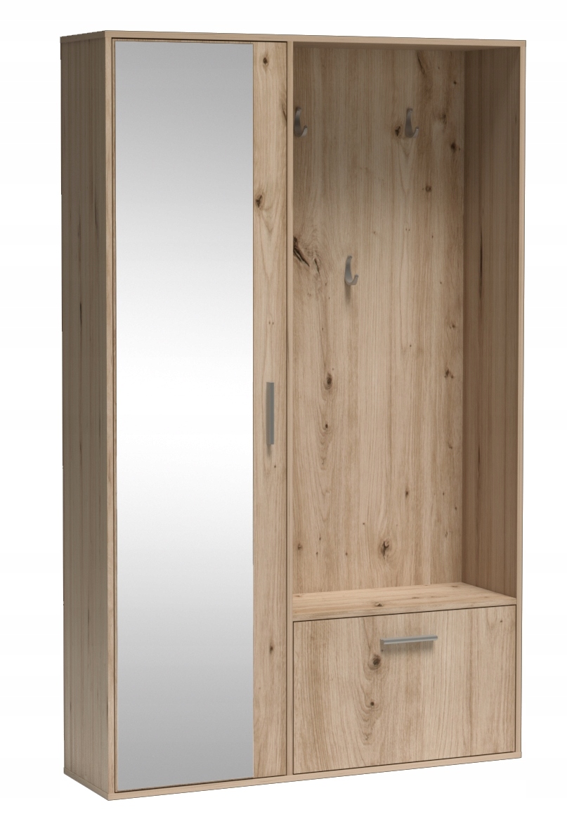 Шкаф с зеркалом и мебель BIS. Снаружи имеются три вешалки, которые идеально подходят для курток, пальто, толстовок и сумок. Ниже находится обувница с перегородкой, которая упрощает организацию. В шкафу слева две полки. Один вверх, другой вниз, это позволяет размещать на них вещи, которые нужно разместить на ровной поверхности. Современный вариант — выдвижная вешалка, подчеркивающая уникальность и функциональность шкафа.